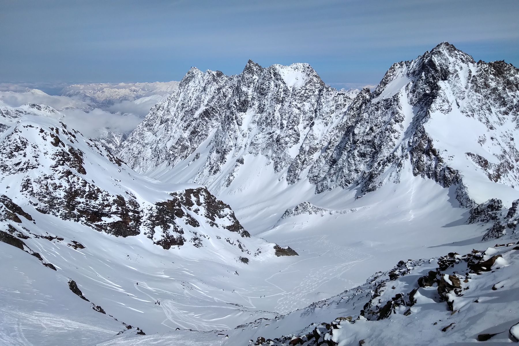 Blick vom Gleirscher Roßkogel nach Nordwesten. Unten links sieht man die Schweinfurter Hütte. Ab dem Nachmittag wurde das Wetter langsam schlechter, aber für die Abfahrt war's noch gut genug. Teilweise schöner Firn!