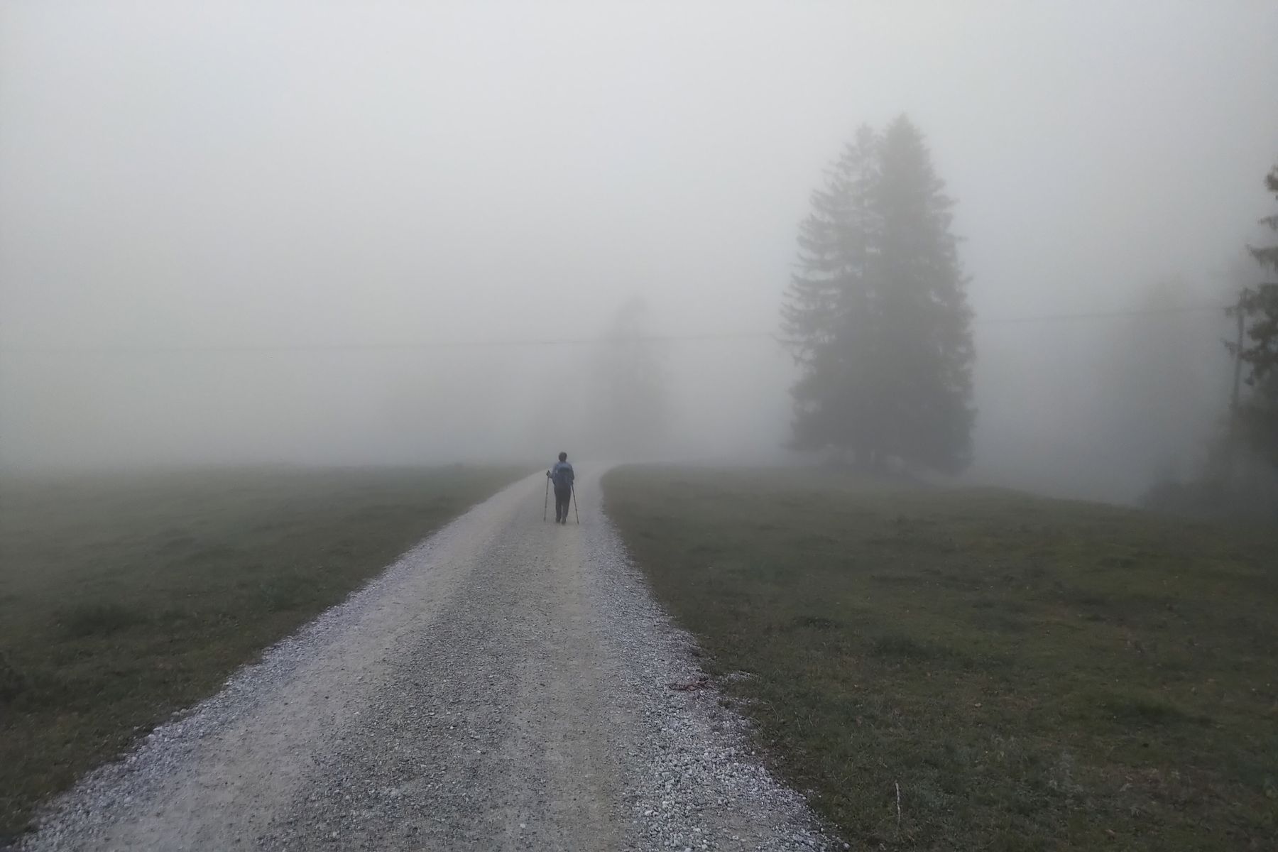 Nicht mehr weit bis zum Gipfel! Ab hier sind wir ganz im Nebel gesteckt, vorher gab's ab und zu ein paar Lücken in der Nebeldecke. Die störenden Geräusche vom Tuxer Skigebiet wurden durch den Nebel leider nicht gedämpft ![]()