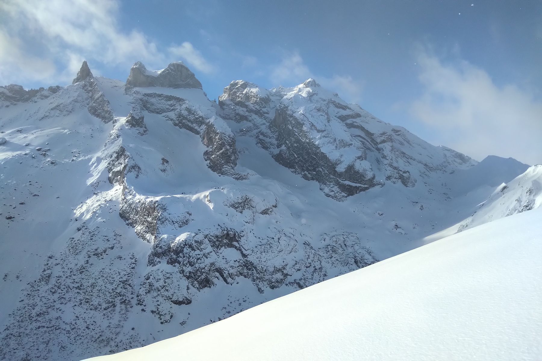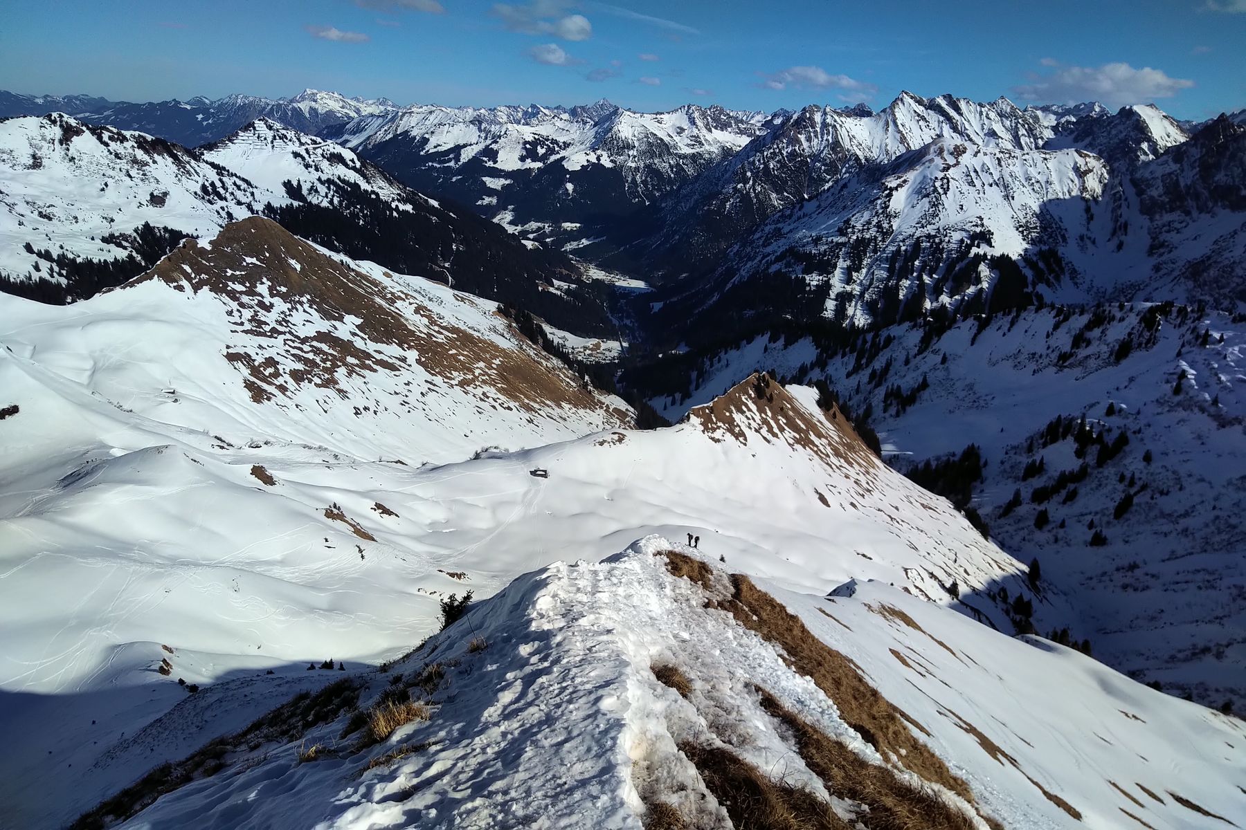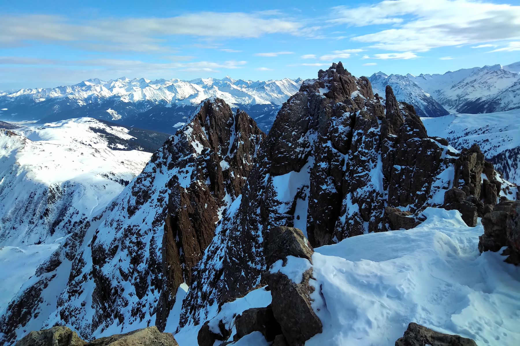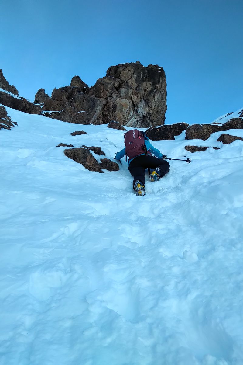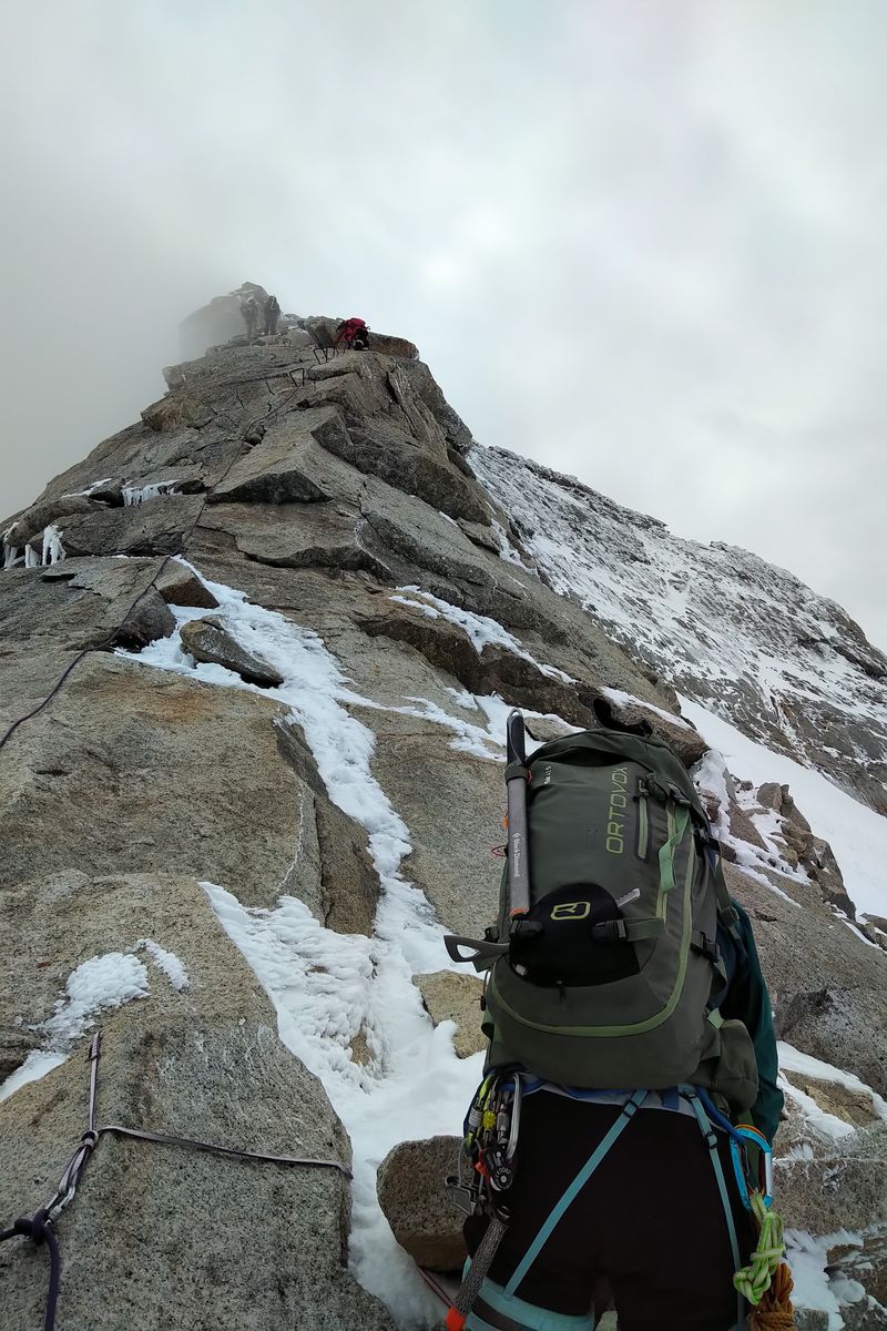 Auf der Querung zum Einstieg auf dem Nordgrat waren Steigeisen hilfreich, wie auch auf dem Großteil von Nordgrat + Riepengrat. Das kann sich natürlich nach ein paar wärmeren Tagen schnell ändern. Der Riepengrat war sehr gut zu gehen, beim Einstieg ist das alte Drahtseil nicht mehr vorhanden (siehe Bericht von guenthi vor 1 Monat), stattdessen eine 25m-Abseilstelle. Den fraglichen Felsblock zum Überklettern kurz vor dem Gipfel konnte ich auch nicht wiederfinden.