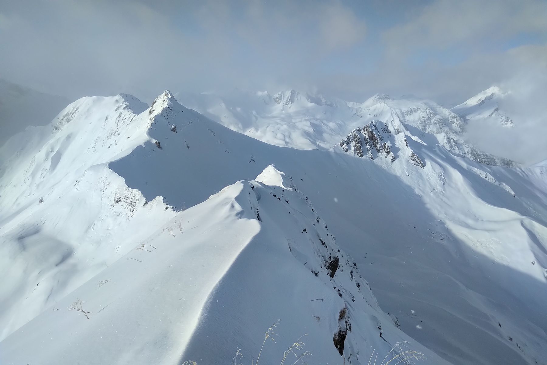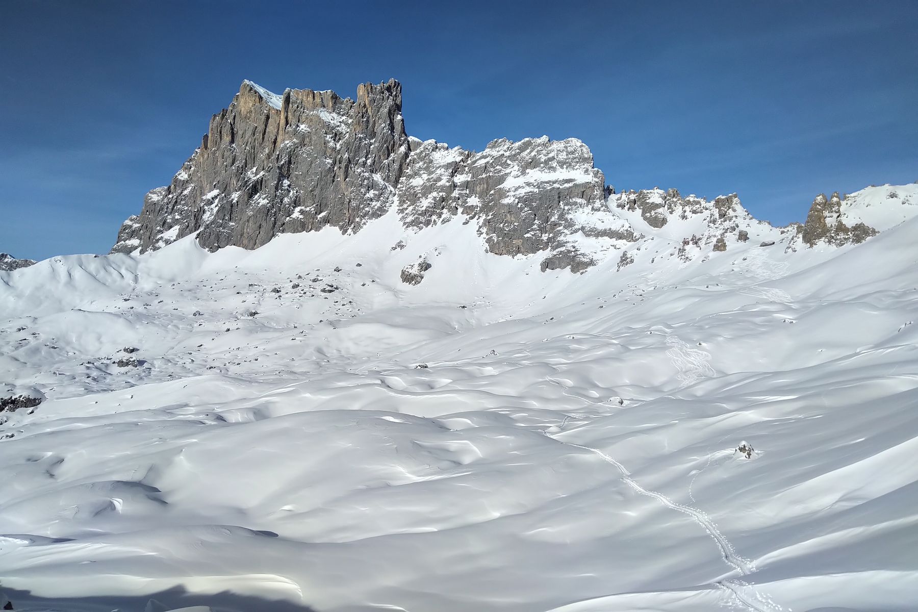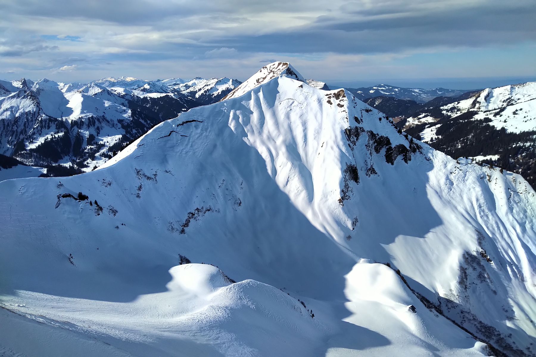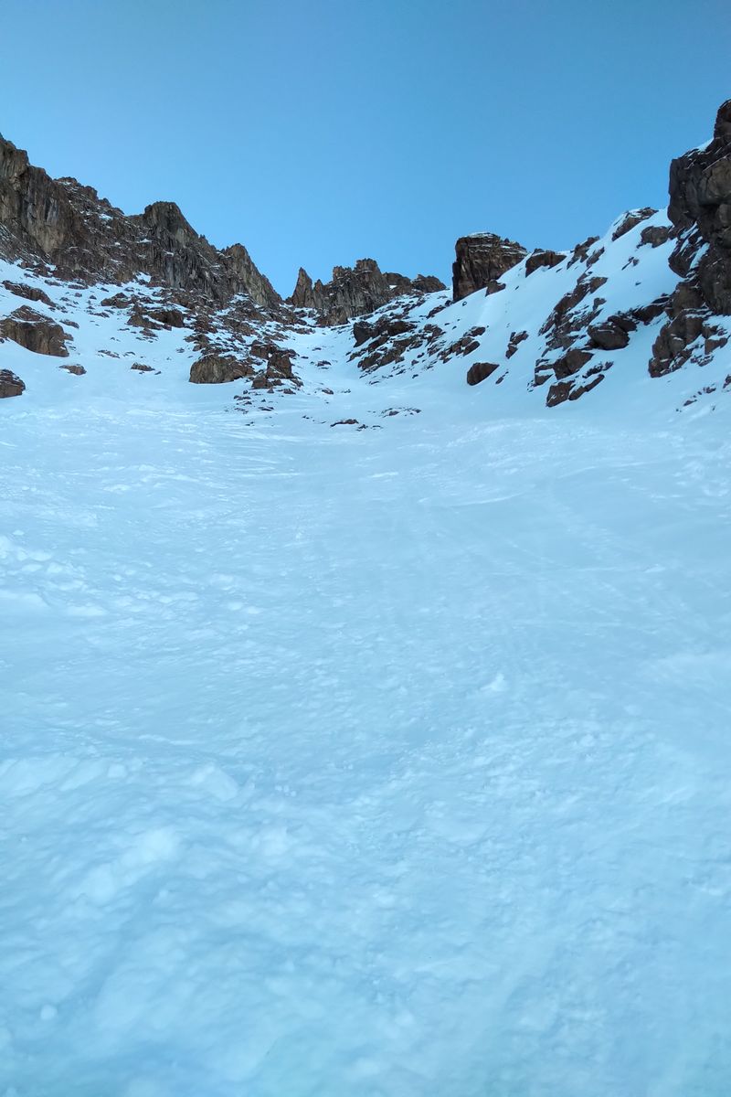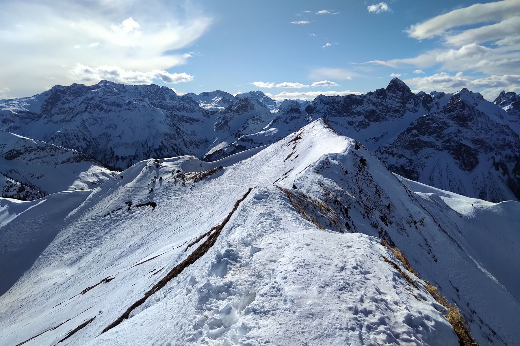 Auf der Querung zum Einstieg auf dem Nordgrat waren Steigeisen hilfreich, wie auch auf dem Großteil von Nordgrat + Riepengrat. Das kann sich natürlich nach ein paar wärmeren Tagen schnell ändern. Der Riepengrat war sehr gut zu gehen, beim Einstieg ist das alte Drahtseil nicht mehr vorhanden (siehe Bericht von guenthi vor 1 Monat), stattdessen eine 25m-Abseilstelle. Den fraglichen Felsblock zum Überklettern kurz vor dem Gipfel konnte ich auch nicht wiederfinden.