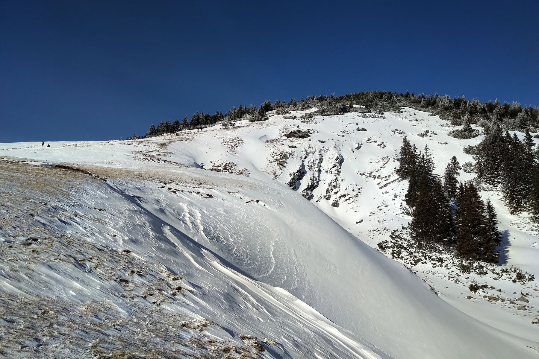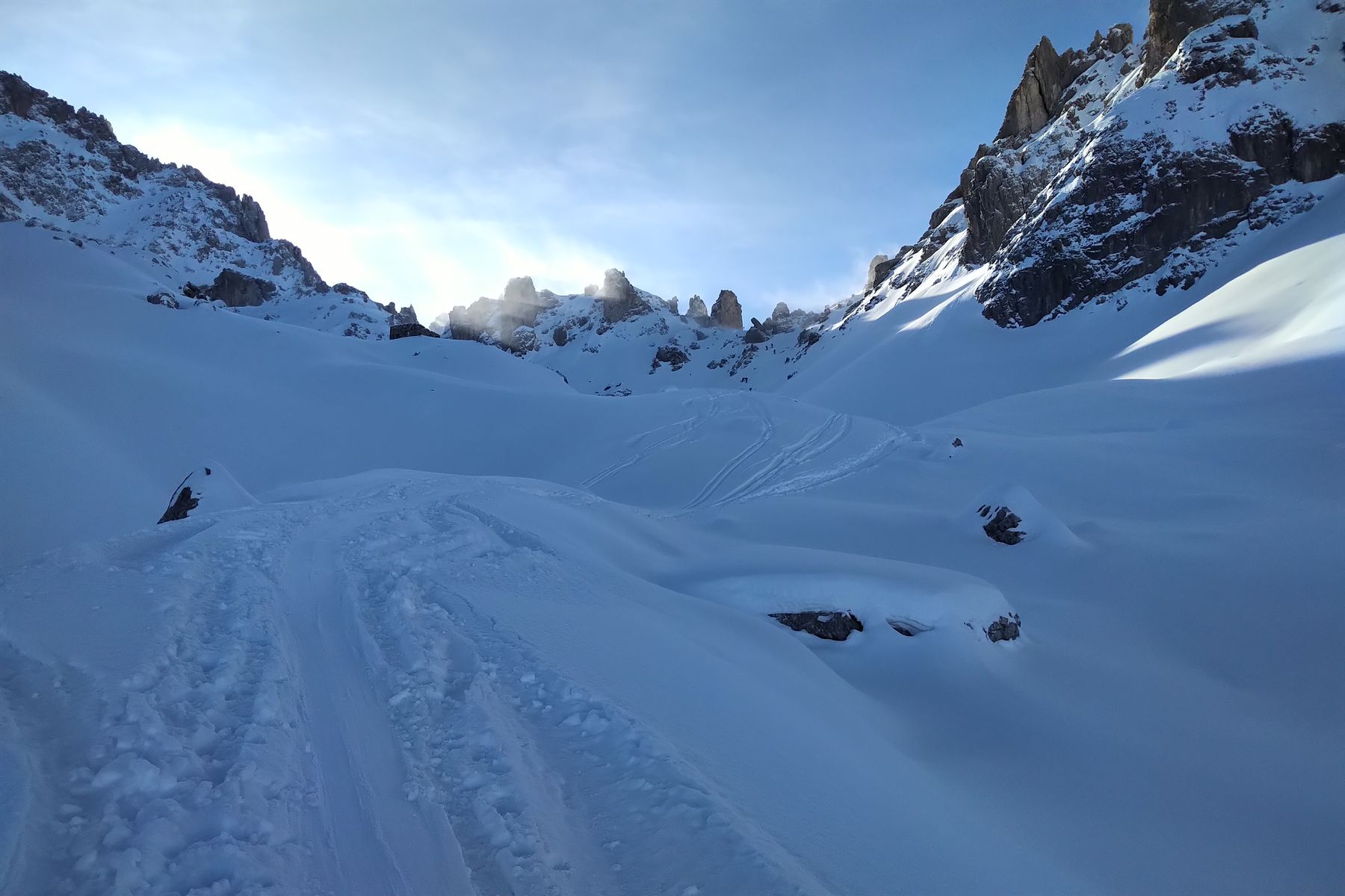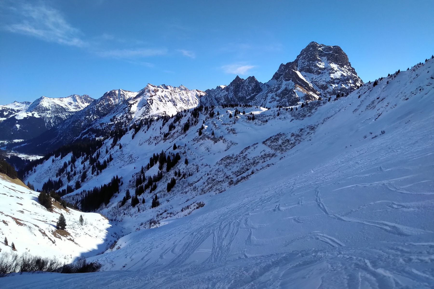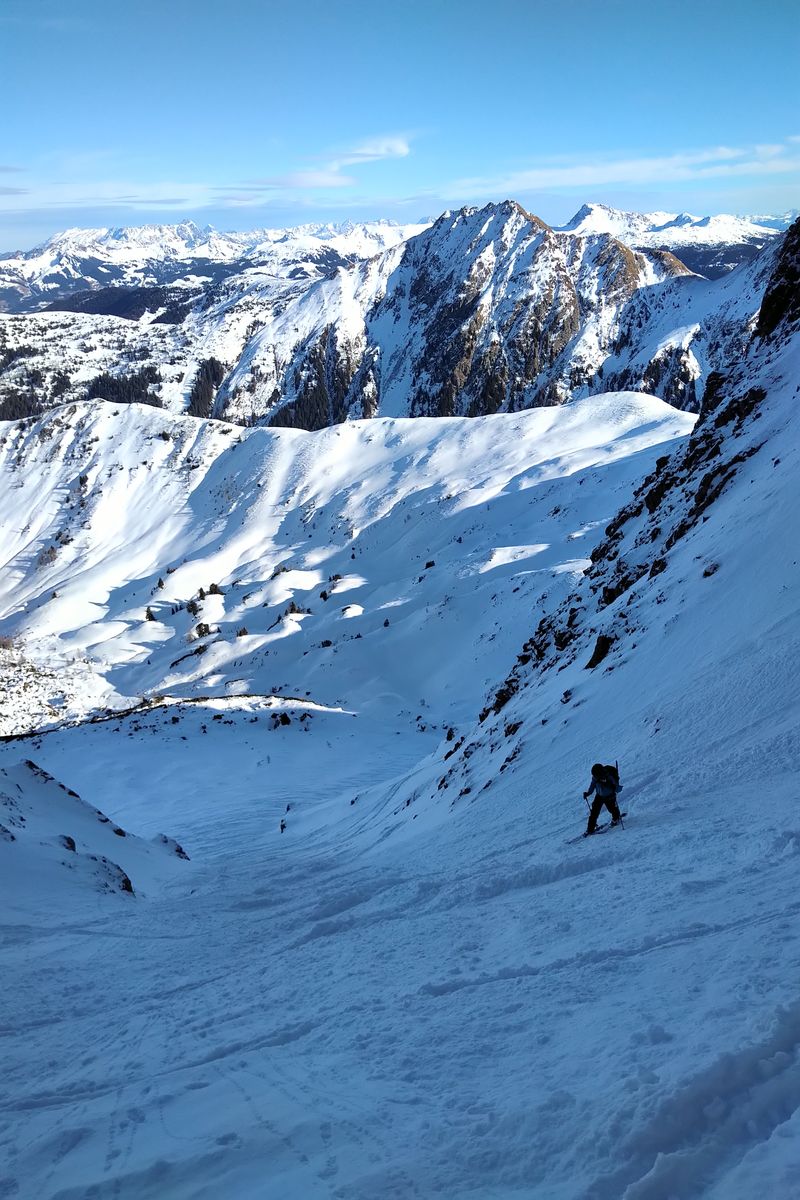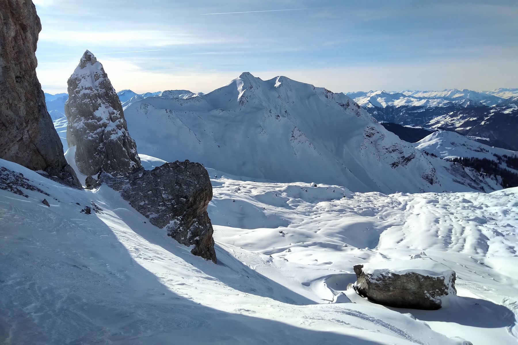 Auf der Querung zum Einstieg auf dem Nordgrat waren Steigeisen hilfreich, wie auch auf dem Großteil von Nordgrat + Riepengrat. Das kann sich natürlich nach ein paar wärmeren Tagen schnell ändern. Der Riepengrat war sehr gut zu gehen, beim Einstieg ist das alte Drahtseil nicht mehr vorhanden (siehe Bericht von guenthi vor 1 Monat), stattdessen eine 25m-Abseilstelle. Den fraglichen Felsblock zum Überklettern kurz vor dem Gipfel konnte ich auch nicht wiederfinden.