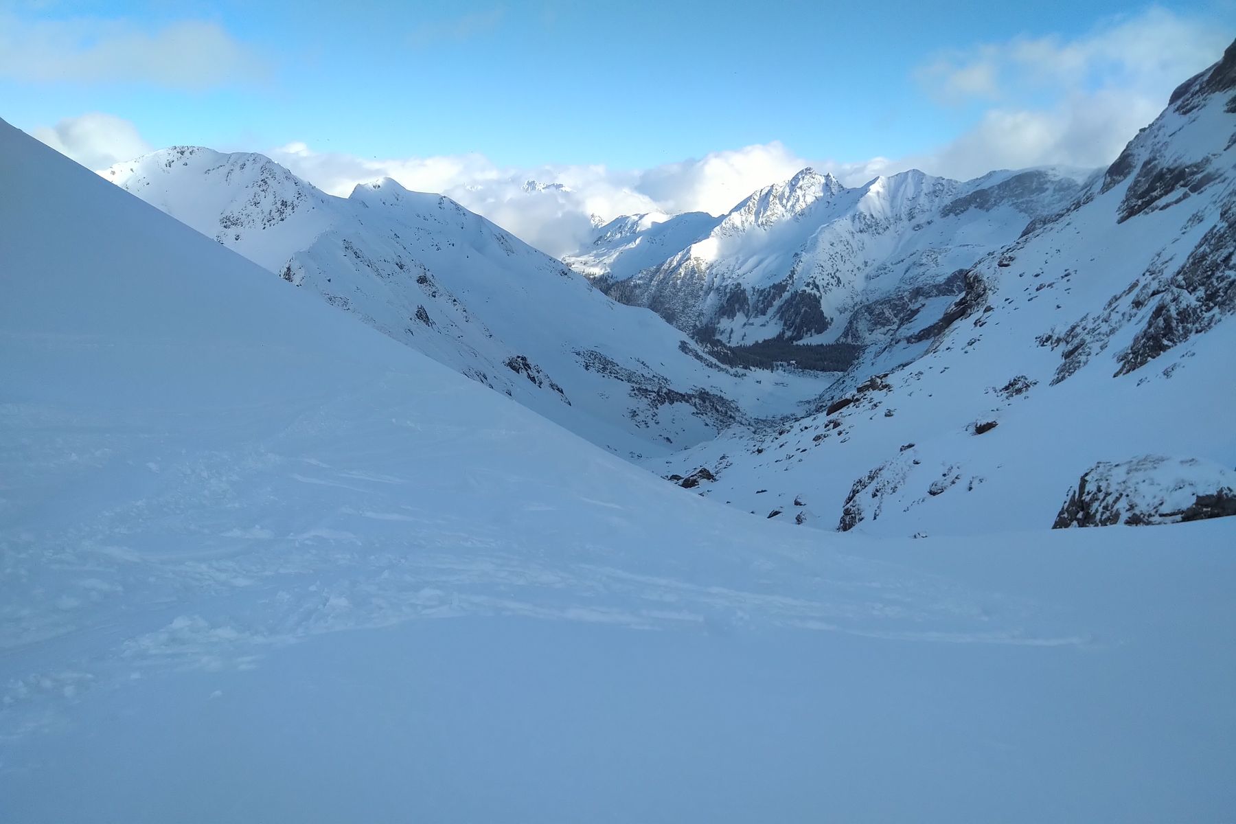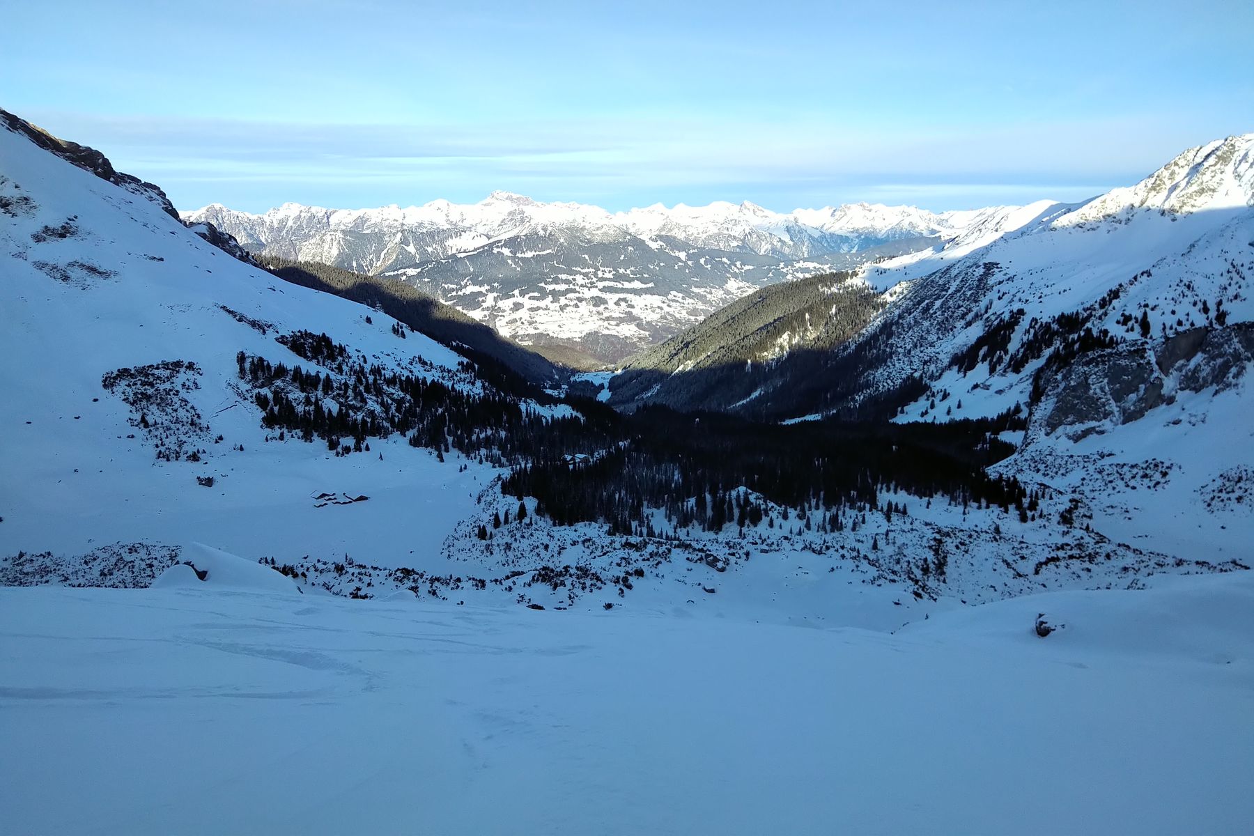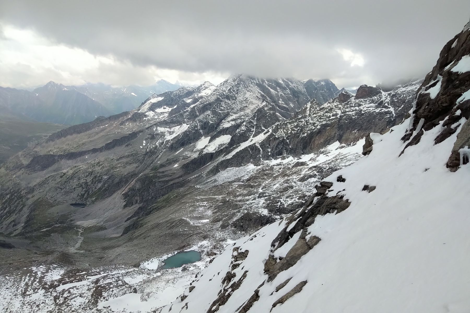 Um die Alpeiner Scharte herum war's mit dem Neuschnee auch etwas rutschig, aber sonst gut zu gehen. Hier sieht man die Nordseite Richtung Valsertal: