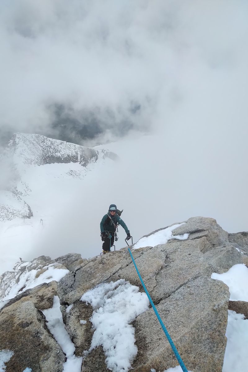 Von den letzten Niederschlägen sind oberhalb von ca. 2700 noch 20 cm Neuschnee liegengeblieben. Dadurch mussten wir auf dem Nordgrat viel durchsichern und das meiste mit Steigeisen klettern. Wir hatten kurz überlegt, den Nordgrat wieder abzusteigen/abzulassen, aber beim Riepengrat konnten wir den Gratbereich schneller hinter uns bringen - dort gibt es bei der einzigen steileren Stelle einen Abseilstand. Der restliche Teil hat dann eben länger gedauert, aber insgesamt war's für uns die bessere Option.