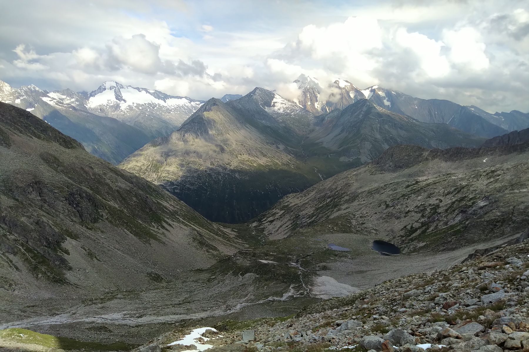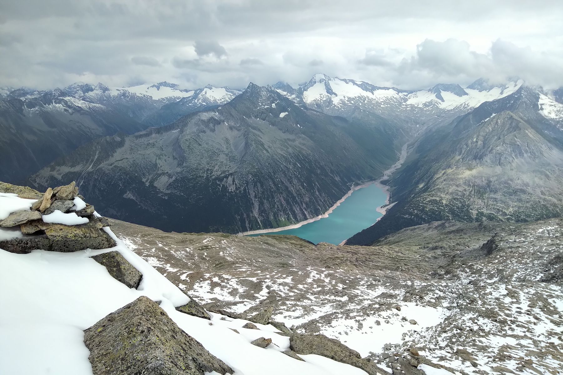 Später am Nachmittag und in tieferen Lagen wurde die Sicht besser. Unten der Schlegeis-Speicher, dahinter der Große Möseler: