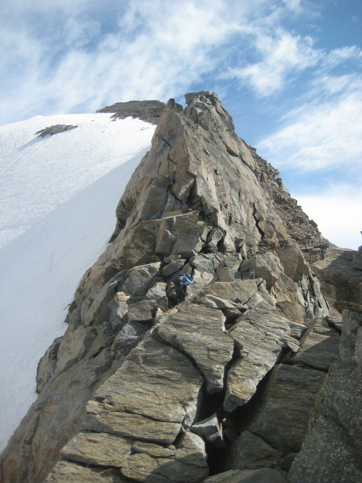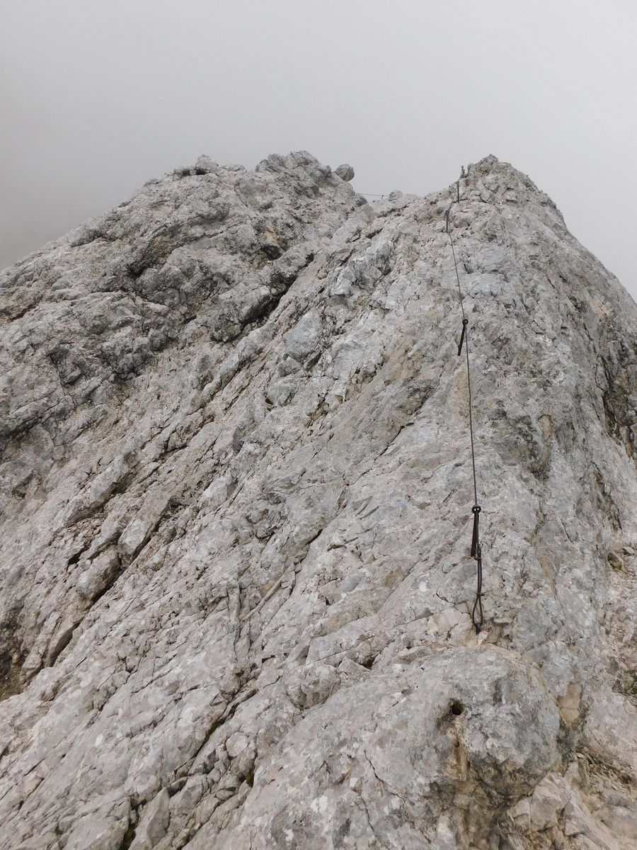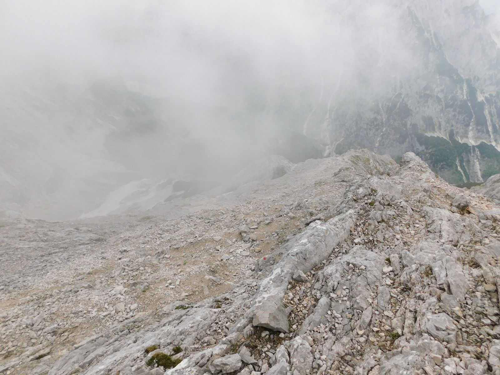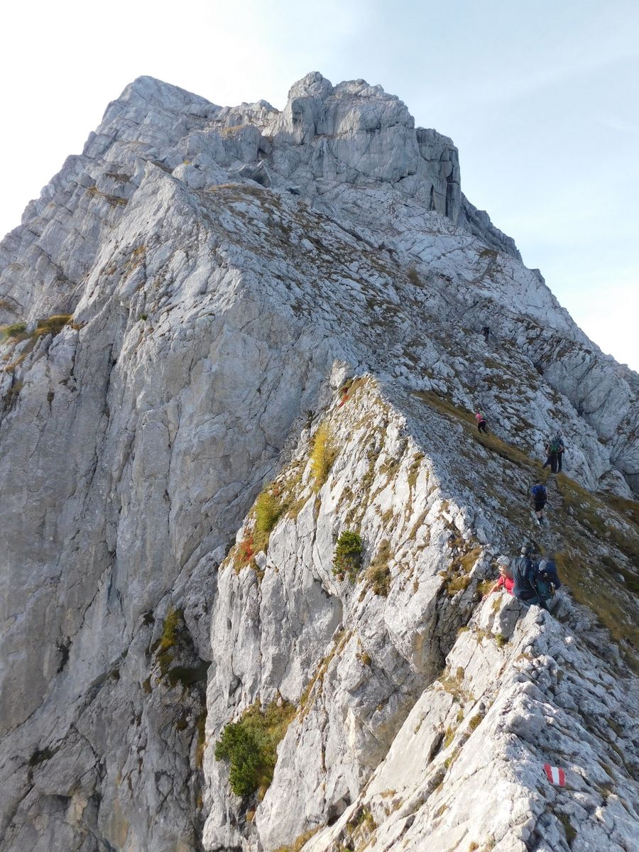 - Nach dem "bösen Band" wird man von den Steinmanndl eher in die Nordflanke geleitet, aber man sollte lieber so bald wie möglich zum Grat hoch - ansonsten muss man später im brösligen Gelände zum Grat hochkraxeln. Vielleicht kann man auch noch weiter in der Nordflanke ausholen und kommt dann viel später auf den Grat - aber dann verpasst man schöne Grat-Passagen