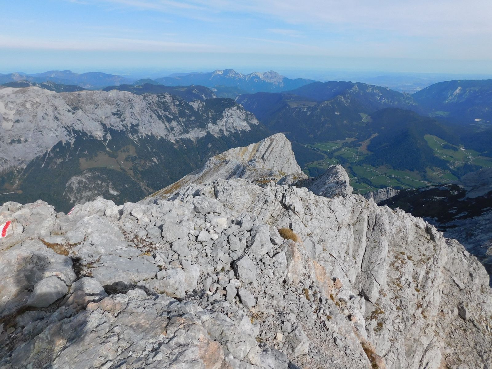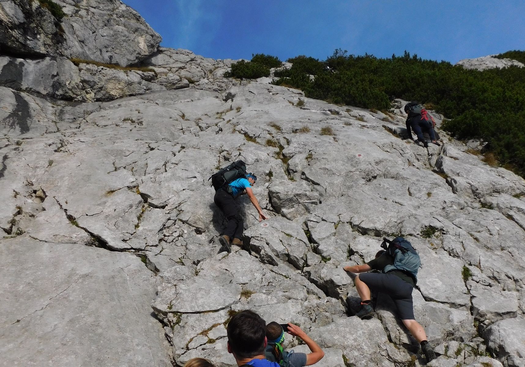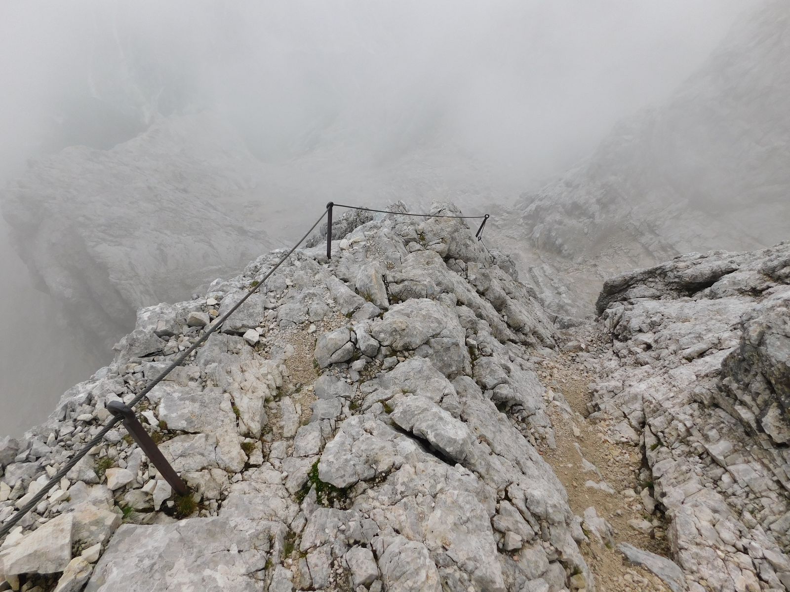 - Nach dem "bösen Band" wird man von den Steinmanndl eher in die Nordflanke geleitet, aber man sollte lieber so bald wie möglich zum Grat hoch - ansonsten muss man später im brösligen Gelände zum Grat hochkraxeln. Vielleicht kann man auch noch weiter in der Nordflanke ausholen und kommt dann viel später auf den Grat - aber dann verpasst man schöne Grat-Passagen