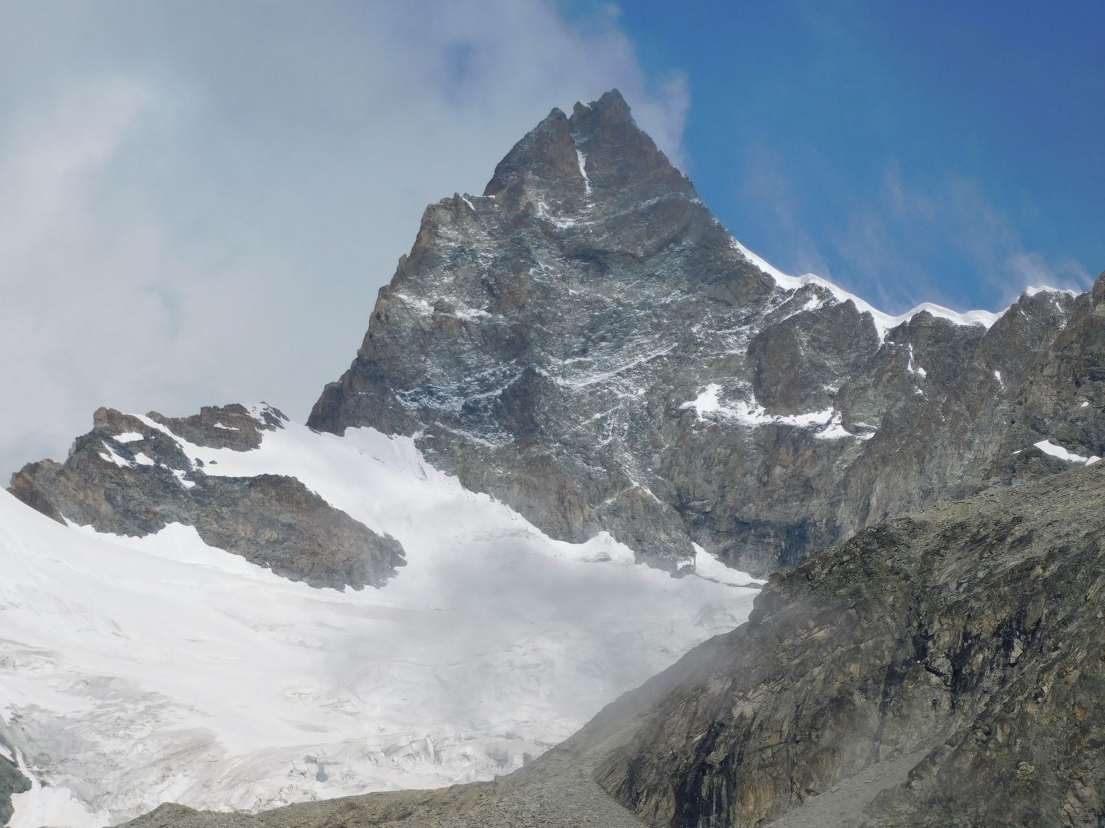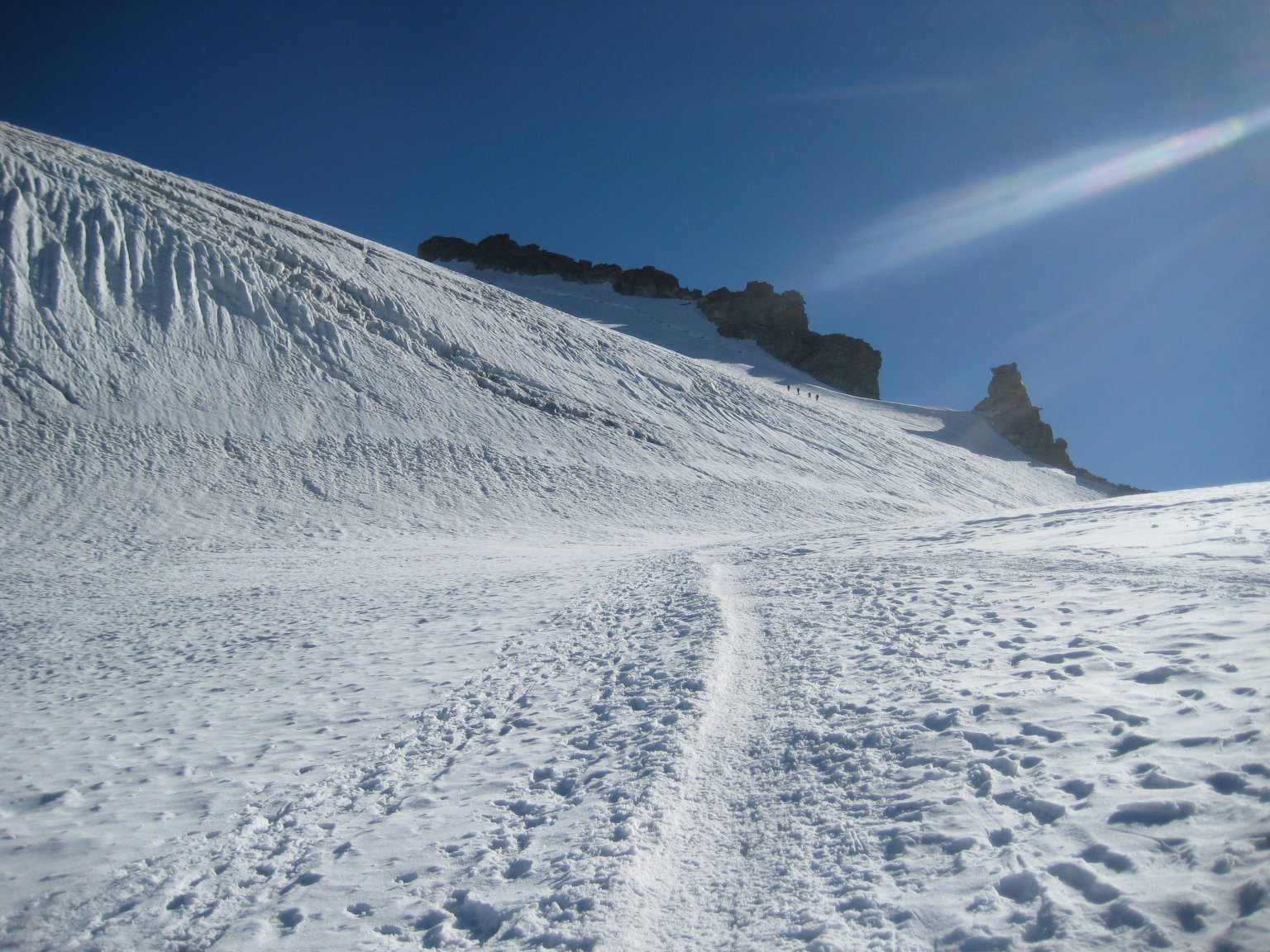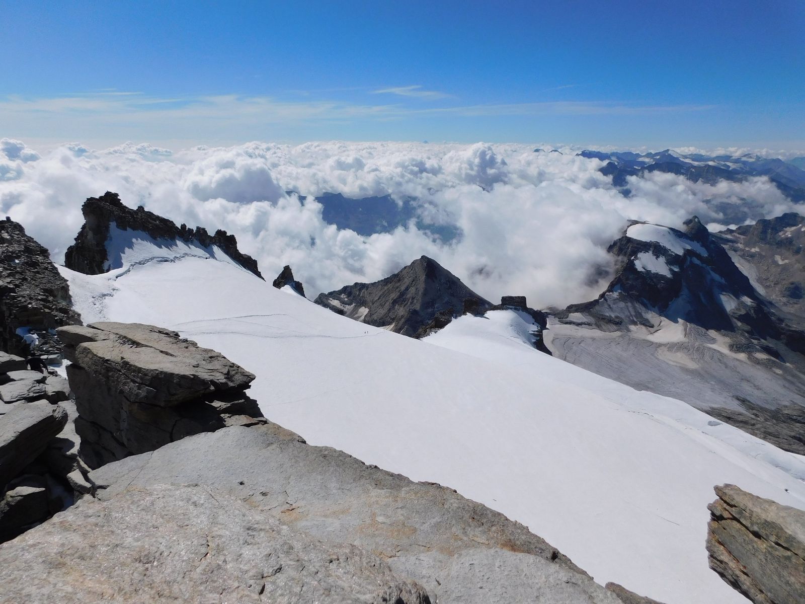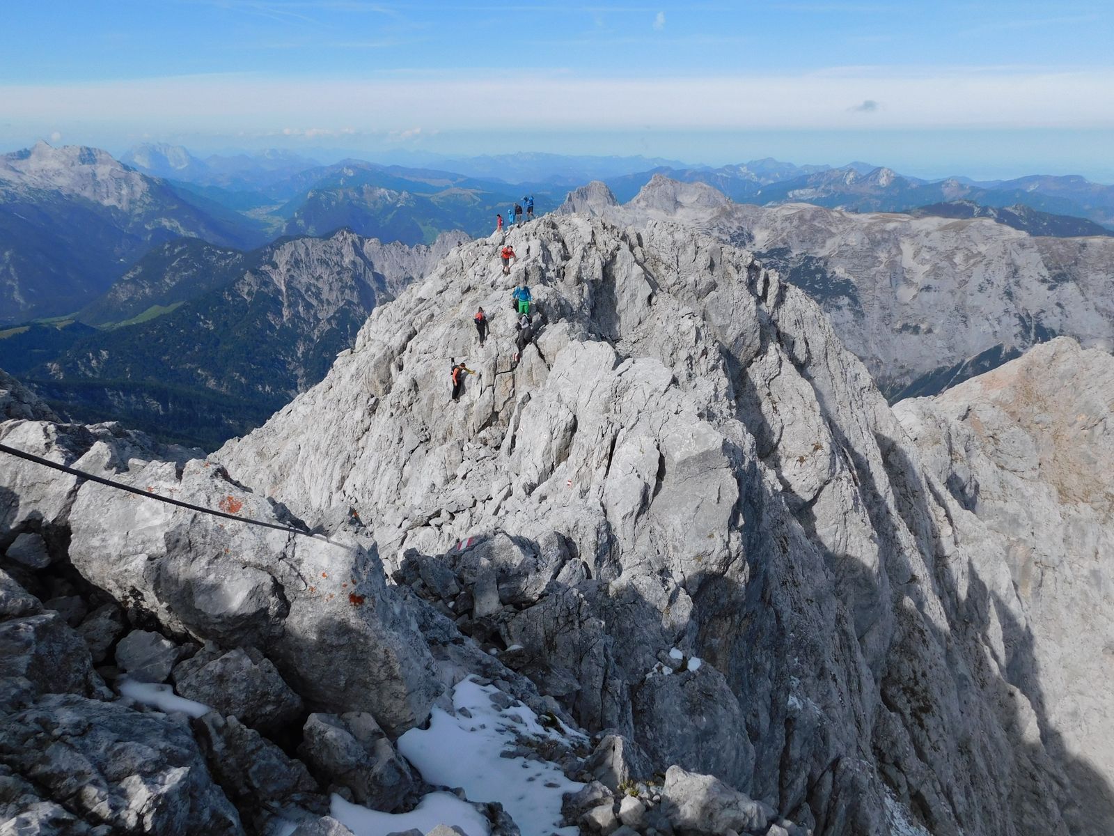 - Nach dem "bösen Band" wird man von den Steinmanndl eher in die Nordflanke geleitet, aber man sollte lieber so bald wie möglich zum Grat hoch - ansonsten muss man später im brösligen Gelände zum Grat hochkraxeln. Vielleicht kann man auch noch weiter in der Nordflanke ausholen und kommt dann viel später auf den Grat - aber dann verpasst man schöne Grat-Passagen
