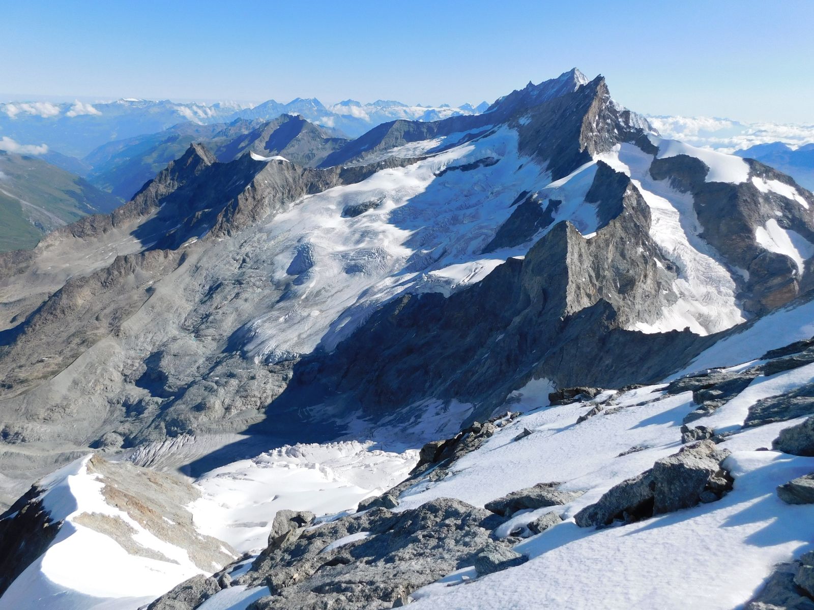 Blick von der Mittleren Arnspitze auf die restliche Tour (hinten die Große Arnspitze). Hier muss man 5-10 Minuten den Aufstiegsweg retour abklettern und dann nach Südosten in einen Pfad abbiegen, der in die nächste Scharte führt (rechts von der Blickrichtung auf dem Bild):