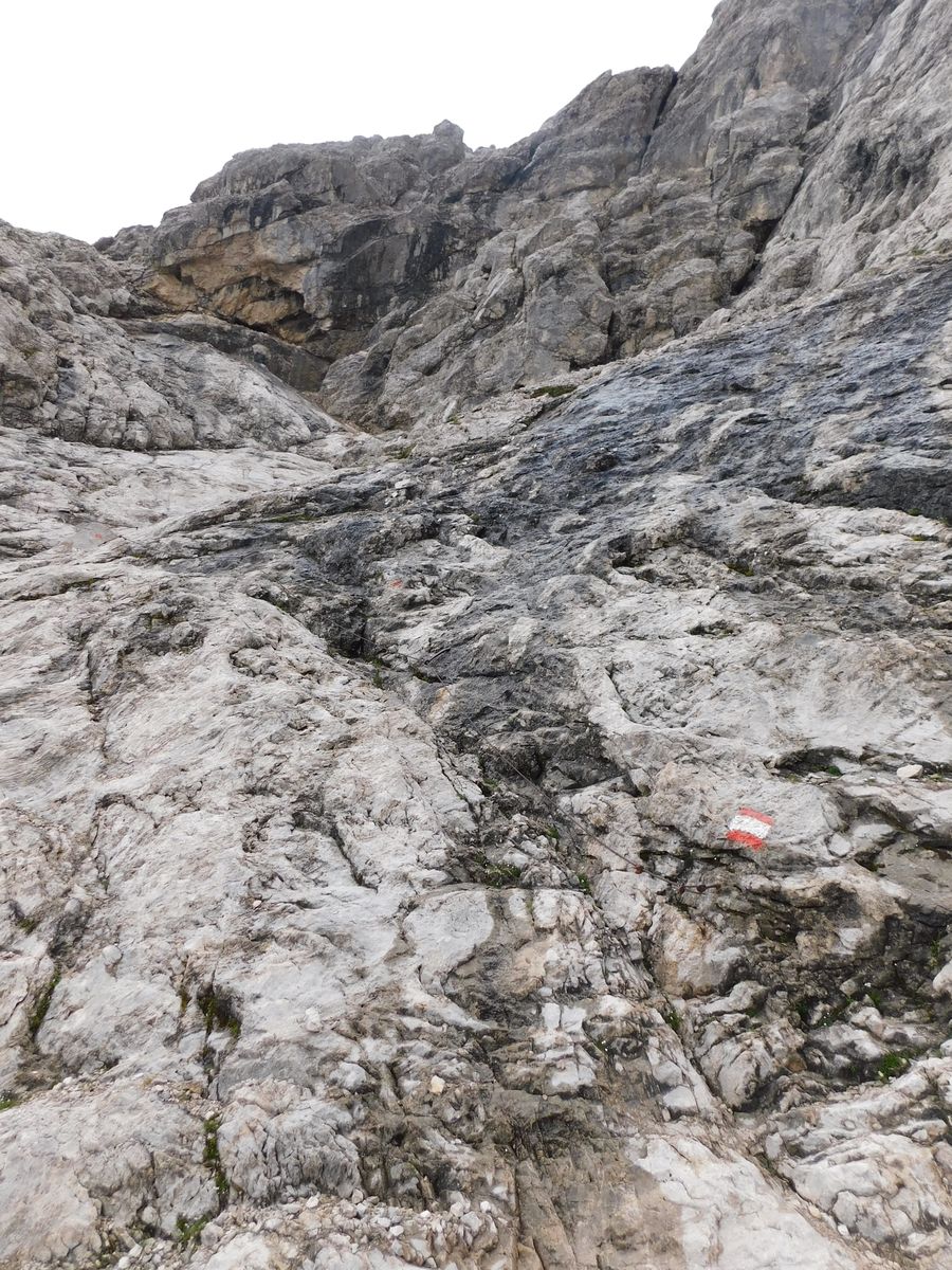 Ab der Arnplattenspitze sind die Markierungen weniger, aber ausreichend. An den schwierigeren Stellen sind entweder Steinmanndl oder kleine blassrote Markierungen. Dazwischen muss man manchmal etwas suchen, aber alles im Rahmen. Nur zwei Stellen sind gut zu wissen: