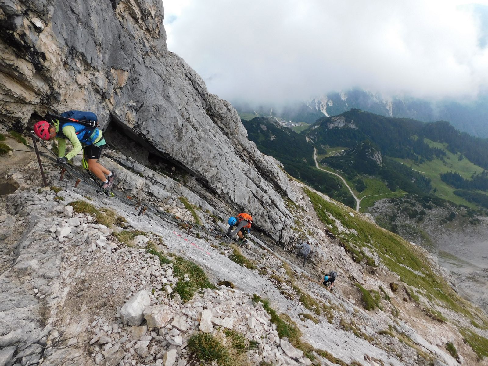Hier das Band von unten, nachdem ichs geschafft habe (in der Bildmitte). Es kann gut sein, dass es auch einfacher gegangen wäre und ich nur die Tritte/Griffe nicht gesehen habe, die trotz Rucksack gut machbar sind. Aber so wars mir lieber, als noch länger herumzuprobieren: