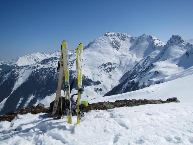 Tourenverhältnisse: Alle Touren ab Parkplatz Luegergraben gehen noch. Joel-Abfahrt apert unten aus. Schöner Firn am SW Hang. Sagtalerspitze war um 11.30 Uhr heute schon sehr sulzig(sh Foto). Der Westhang des Großen Galtenbergs (Foto) wäre vielleicht schöner zu fahren gewesen. Scheint übrigens von ganz oben zu gehen, was ja nicht so oft möglich ist.