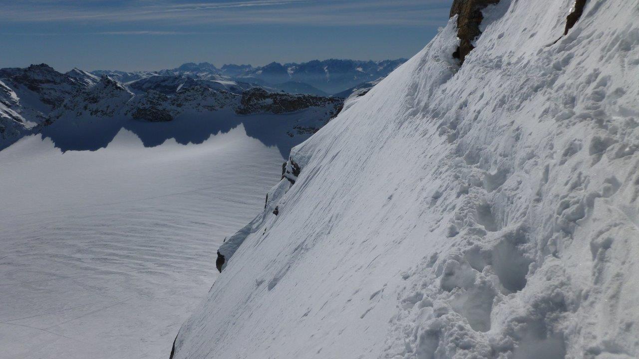 Gefahreneinschätzung: Bei der Aufstiegsvariante C ist eine Querung dabei, die vielleicht nicht jedem taugt, und die bei Harsch evt. nur mit Steigeisen zu bewältigen ist. Umkehren an dieser Stelle ist wegen der kurz davor liegenden Gratüberquerung auch nicht einfach. Wir hatten weichen Schnee mit sicheren Fußstapfen, so dass nur Konzentration notwendig war, siehe Foto.