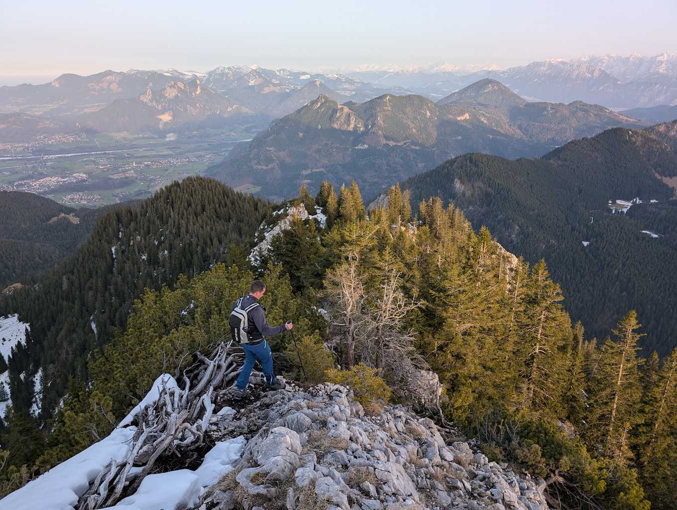 Spannende und etwas anspruchsvollere Voralpentour im Schatten des Wendelsteins. Zustieg auf Forststraßen per (e)Bike bis zur Schuhbräualm. Auf dem markierten Wanderweg zur Rampoldplatte (viele Gleitschirmflieger) und weiter über den Kamm Richtung Hochsalwand. Vor dem Lechnerkopf beginnt der interessante Teil der Tour. Es scheint auf den Lechnerkopf auch einen direkten Aufstieg von Norden zu geben, der hat aber wild ausgeschaut und es liegt Altschnee drin, daher haben wir uns dagegen entschieden. Auf dem markierten Steig geht es also unterhalb vorbei (auch hier ist Stand 6.3. das eine oder andere Altschneefeld vorsichtig zu queren). Wo nun der beschilderte Steig zur Hochsalwand rechts weggeht, sind wir nach links zur Scharte zwischen Lechnerkopf und Hochsalwand gequert. Aufgrund der späteren Uhrzeit den Lechnerkopf nicht mehr mitgenommen (würde derzeit von der Seite aber super gehen), sondern gleich zum Nordanstieg auf die Hochsalwand. Gerade der erste Teil ist ausgesetzt und verlangt eine Kletterei im oberen I. Grad (davon leider keine Fotos). Sofern man hier nicht von der Route abkommt, bewegt man sich aber in trockenem Fels. Nach der ersten Steilstufe ist es dann nicht mehr so ausgesetzt, hier gibt es noch ein paar kleine Schneefelder. Am Gipfel auch am späten Nachmittag noch sehr mild und windstill. Abstieg nach Osten auf ebenfalls nicht beschildertem, aber gut erkennbarem Pfad. Man umrundet damit den Kessel der Lechneralm und steig am Schluss zu dieser ab. An der Rampoldplatte vorbei quert der Weg zur Rampoldalm. Von dort auf der Aufstieg-/Auffahrtsroute zurück.