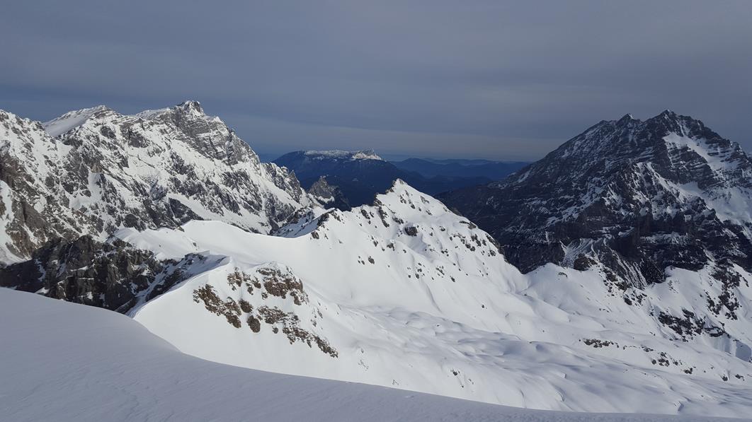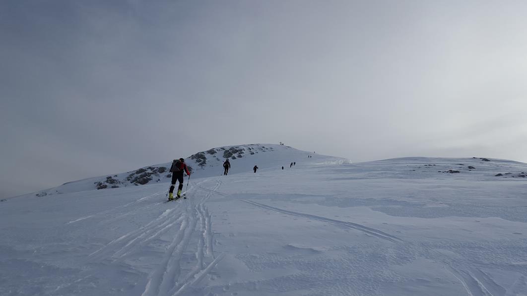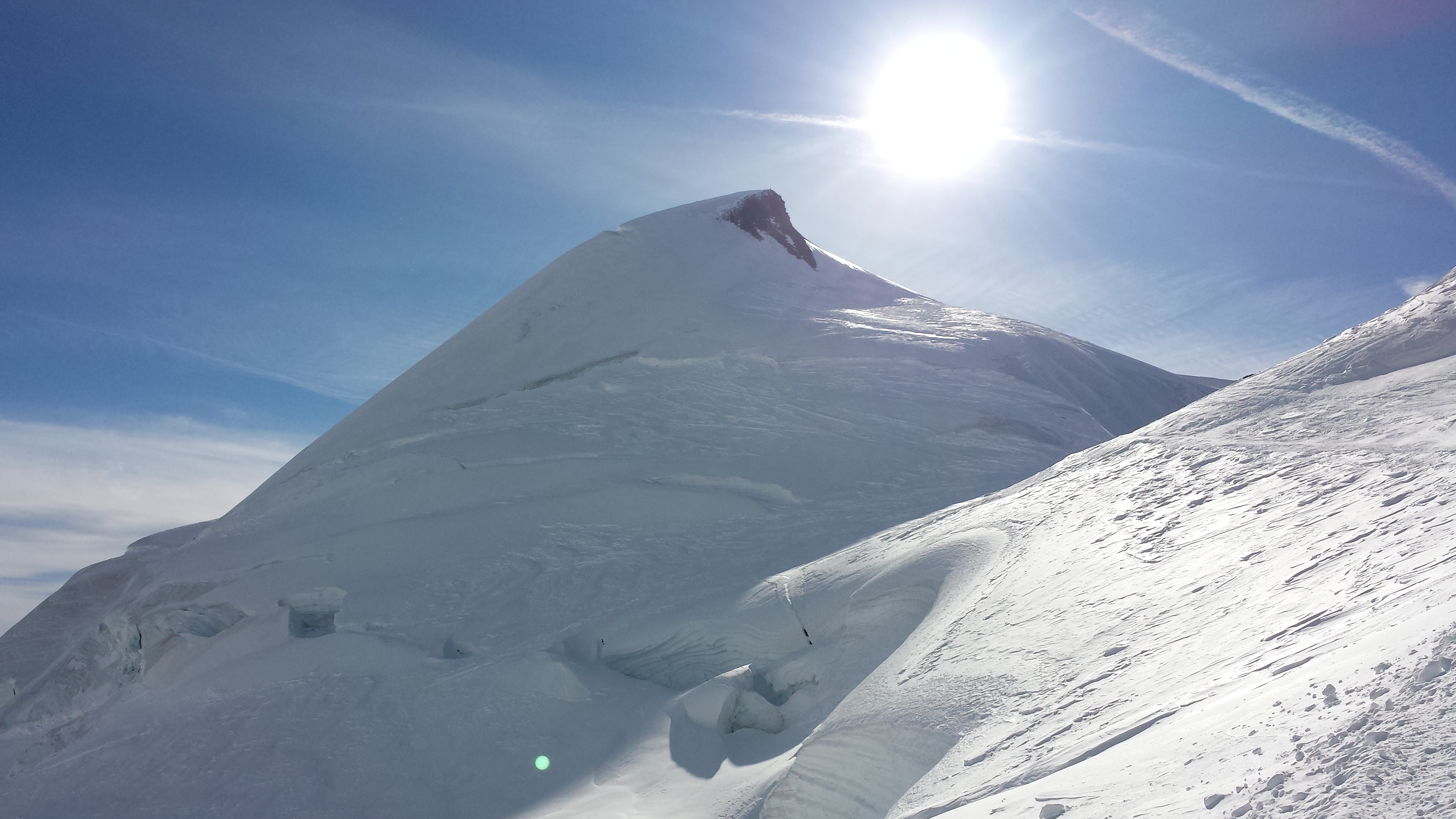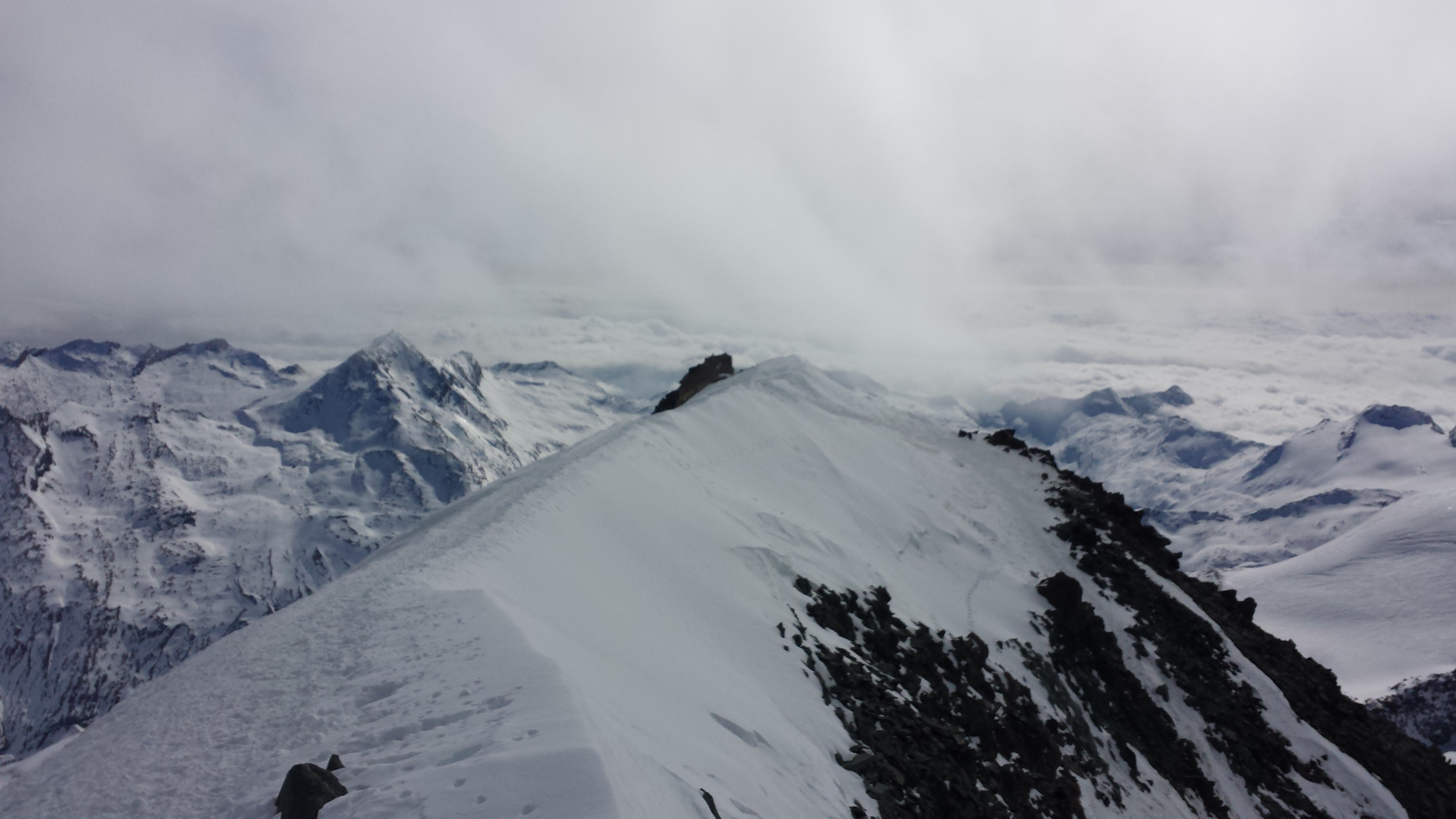 Tourenverhältnisse: Spalten gut eingeschneit. Im Aufstieg rutschig zu gehen. MIt Harscheisen aber problemlos machbar. Gipfelhang der auf den vorderen Allalingrat führt mit Steigeisen gut machbar. Teilweise Blankeisstellen die man aber umgehen kann. Am GIpfel starker Wind. In der Abfahrt Windgepresster Pulver und Harsch der pickelhart zu fahren war. Ingesamt wenig los war alleine am Gipfel-