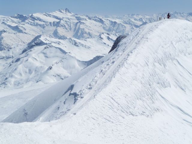 Geigerscharte ist mit meist festem Schnee bedeckt, die Felsen kommen heraus, teilweise sind sie frei.