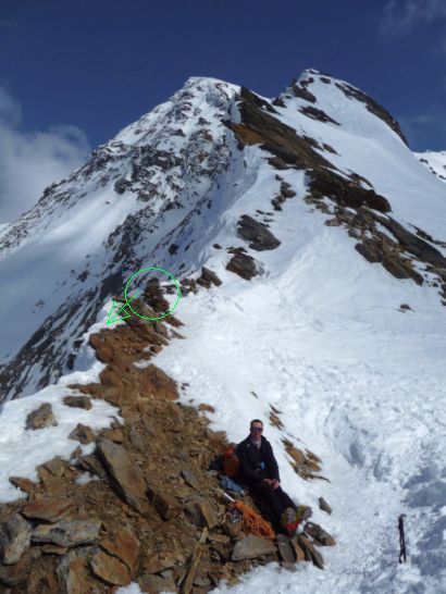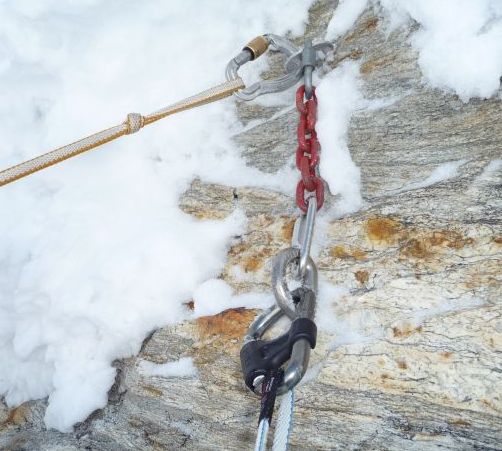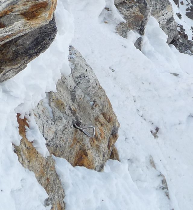 Abseilstände vorhanden, ein Zwischenhaken auf weisser Felszunge (kein Schnee, sieht aber ähnlich aus!).