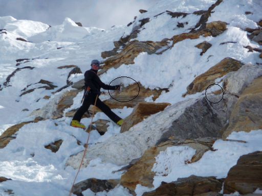Der Einstieg erfolgt günstig seitlich vom Zwischenstand/Zwischenhaken wegen Steinschlag. Ein paar Meter vom Schneefeld in den Fels steigen. Dann Queren an Felssims, mit Fingerleisten auf die weisse Felszunge zu. (vgl. Fotos/Topo)