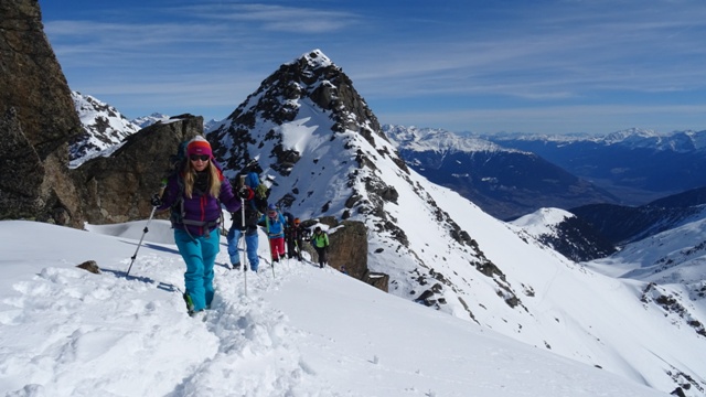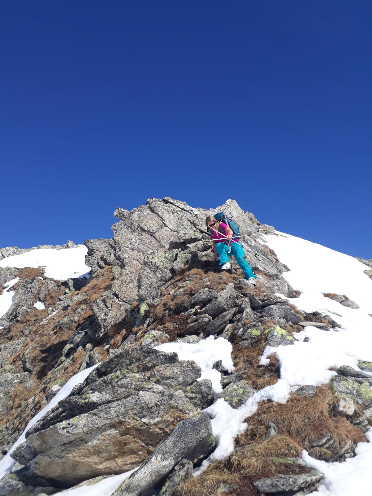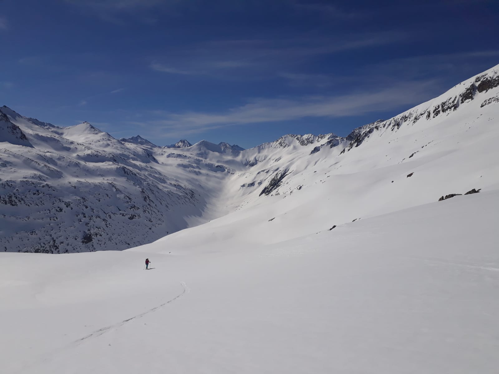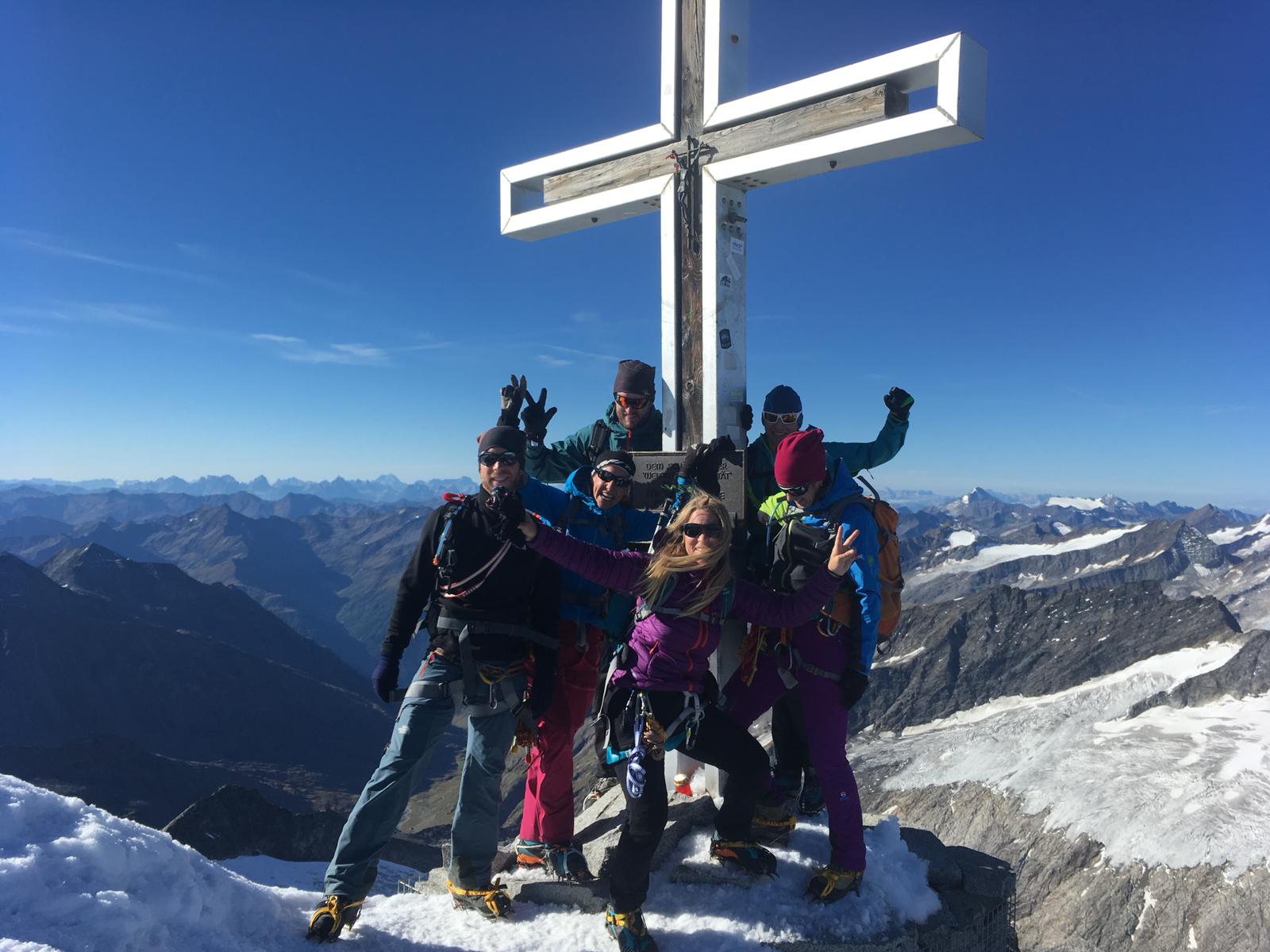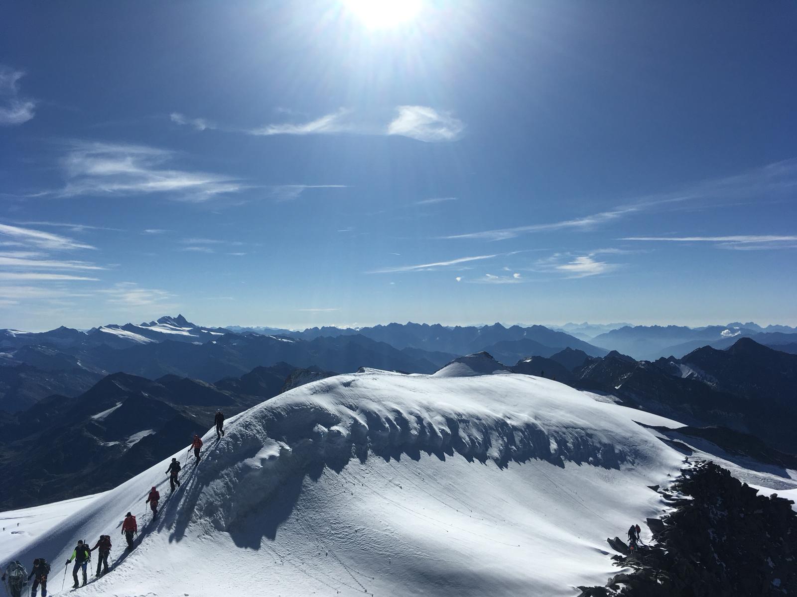 War das ein "Gschiss" bis wir - und auch der Wetterbericht- endlich wussten, was wir wollten! Naja ...wir - und ganz besonders ICH – wussten eigentlich längst, was wir wollten. „Auffi“ wollten wir! „Auffi“ auf den Venediger. Diesmal stand der Termin seit langem fest und alles hing nur noch vom Wetter ab. Erst gegen Mitte der Woche schwenkte die Wetter-Prognose von mittelschlecht auf hervorragend um und wir entschieden uns für das "Go". Ein weiser Entschluss, denn die Bedingungen für die Besteigung des Großvenediger waren grandios bis nahezu perfekt. Wir fuhren am Samstag früh nach Hinterbichl, düsten mit dem Hüttentaxi bis zur Johannishütte und stiegen bei strahlendem Sonnenschein und milden Temperaturen zum Defreggerhaus auf. Den restlichen Nachmittag nutzen wir dazu, unsere Gletscherkurs-Kenntnisse aufzufrischen und im Gelände hinter dem Defreggerhaus die "Lose Rolle" zu üben. Erst als es Zeit war zum Abendessen beendeten wir das Training und ließen uns das sehr übersichtliche Essen der Halbpension schmecken. Peter, der Bergführer gab uns noch ein paar Tipps für die Tour und versicherte uns, dass es selten so optimale Bedingungen gäbe, wie an diesem Wochenende. Wir gingen bald zu Bett und freuten uns alle "unbandig" auf den nächsten Tag. Das Einschlafen fiel zwecks geselliger Runde in der Stube sehr schwer. Somit war der Schlaf nicht besonders erholsam. Die ersten Bergsteiger verließen die Hütte bereits um 4:00 Uhr - sie wollten zum Sonnenaufgang oben sein. Diesen Anspruch hatten wir nicht- Daher hielten wir es für ausreichend, um 6:00 Uhr zu frühstücken und um 06:45 Uhr aufzubrechen. Unser 6-er Team startete rechts hinter der Hütte hoch in Richtung Großvenediger. Bis zur Anseilstelle geht es zunächst stetig bergauf über plattige Felsen bis zum Mullwitzaderl. Nach ein paar Metern bergab beginnt dann die Gletscherpassage. Wir hatten am Vorabend schon ausgemacht, wer von uns sechs Freunden welche Position in der Seilschaft einnimmt. Somit waren wir nach dem Anlegen der Steigeisen relativ schnell angeseilt on Tour. Die Route quert zunächst nur sanft ansteigend übers Innere Mullwitzkees aufs Rainerhorn zu und an dessen felsiger Südwestflanke vorbei. Es ist beeindruckend, wie tief sich die Spalten auftun, wie sie aufklaffen und wie sich der Blick hinein in die schwarze Dunkelheit verliert. Der komplette Weg hinauf zum Großvenediger ist allerdings momentan perfekt gespurt und es ist entsprechend einfach sich zu orientieren. Die Spalten sind derzeit alle begehbar. In Serpentinen geht es dann über den oberen Keesboden zur Gipfelschneide des Großvenediger. Der von vielen gefürchtete (auch von mir!!!) und sehr unterschiedlich beschriebene Grat zum Gipfel ist derzeit optimal zu begehen. Feste Schneeauflage und sehr breit. Ich hatte keinerlei Bedenken und habe mich pudelwohl gefühlt – das Gipfelkreuz im Blick, die Sonne und den herrlich blauen Himmel über mir, am Seil vor und hinter mir liebe und zuverlässige Menschen und der Erfüllung eines großen Traumes nur noch wenige Meter entfernt. Es huschten sogar einige Tränen des Glücks über meine Wangen, als wir nach gut zwei Stunden am Gipfelkreuz standen und uns mit „Berg heil“ beglückwünschten und um die Wette strahlten. Was für ein Tag! Was für ein Wetter! Was für eine Idee! Was für ein Glück! Juchuuuuuu!!!! Wir blieben ein Weilchen am Gipfel, genossen die Aussicht und stiegen dann zum Hohen Aderl (3.504m) ab. Dort beratschlagten wir die Option, den Tag zu nutzen und ihn mit der Venediger Krone zu vollenden. Die Entscheidung viel schnell – Tage wie diese sind ein Geschenk. Wir machen die Krone!!! Sodann ging es weiter zum Rainer Horn. Dort machten wir Rast, stärkten uns mit einer Brotzeit und genossen den Ausblick auf den Großvenediger und die zahlreichen Gipfel rings herum. Wir waren uns alle einig – hier – wo sonst niemand war, außer uns – war es schöner und idyllischer als am Gipfel zuvor. Der Ausblick war grandios. Frisch gestärkt stiegen wir vom Rainer Horn ab (…wir wählten eine unvorhergesehene interessante Variante die uns eine überraschende und anspruchsvolle Geländebewältigung bescherte) und gingen vorbei an der schwarzen Wand über den hohen Zaun zurück zum Defreggerhaus. Die bunten Schirme der Paraglider schwebten über uns hinweg, der Großglockner (…vielleicht eine Option für den nächsten Sommer?) erhob sich imposant in der Ferne, die zarten Schleierwolken tanzten im blauen Himmel die vielen Berggipfel und unsere Gesichter strahlten um die Wette. Was für ein perfekter Tag!!! Gegen 14:30 Uhr erreichten wir das Defreggerhaus. Mit einem kühlen Bier stießen wir auf die perfekte Seilschaft und die Traumtour an und wanderten dann hinab zur Johannishütte. Dort gönnten wir uns noch ein ausgezeichnetes Abendessen, ehe wir um 17:30 Uhr mit dem Hüttentaxi zurück zum Parkplatz fuhren. Mei, war des scheeeeee!!!!