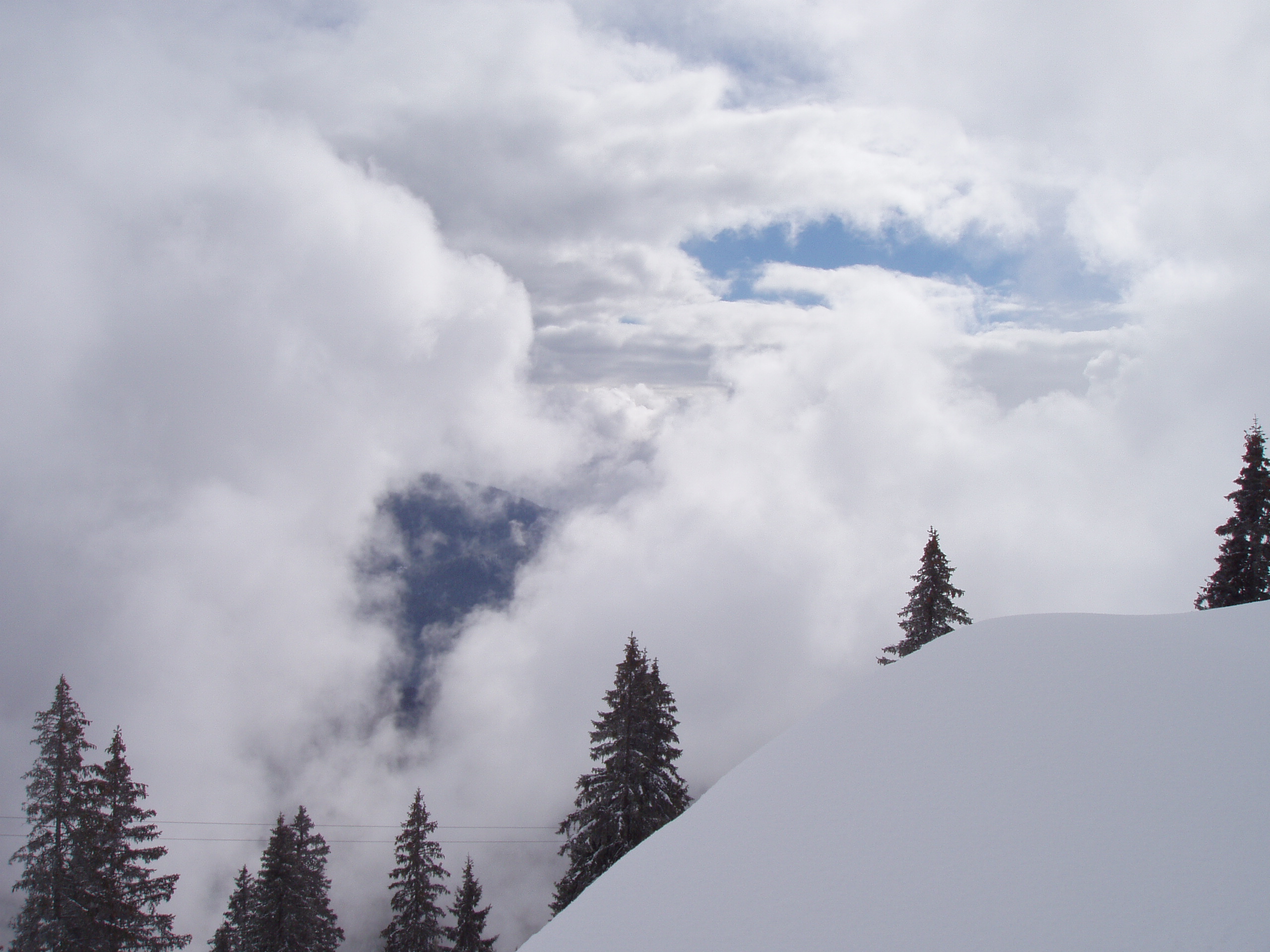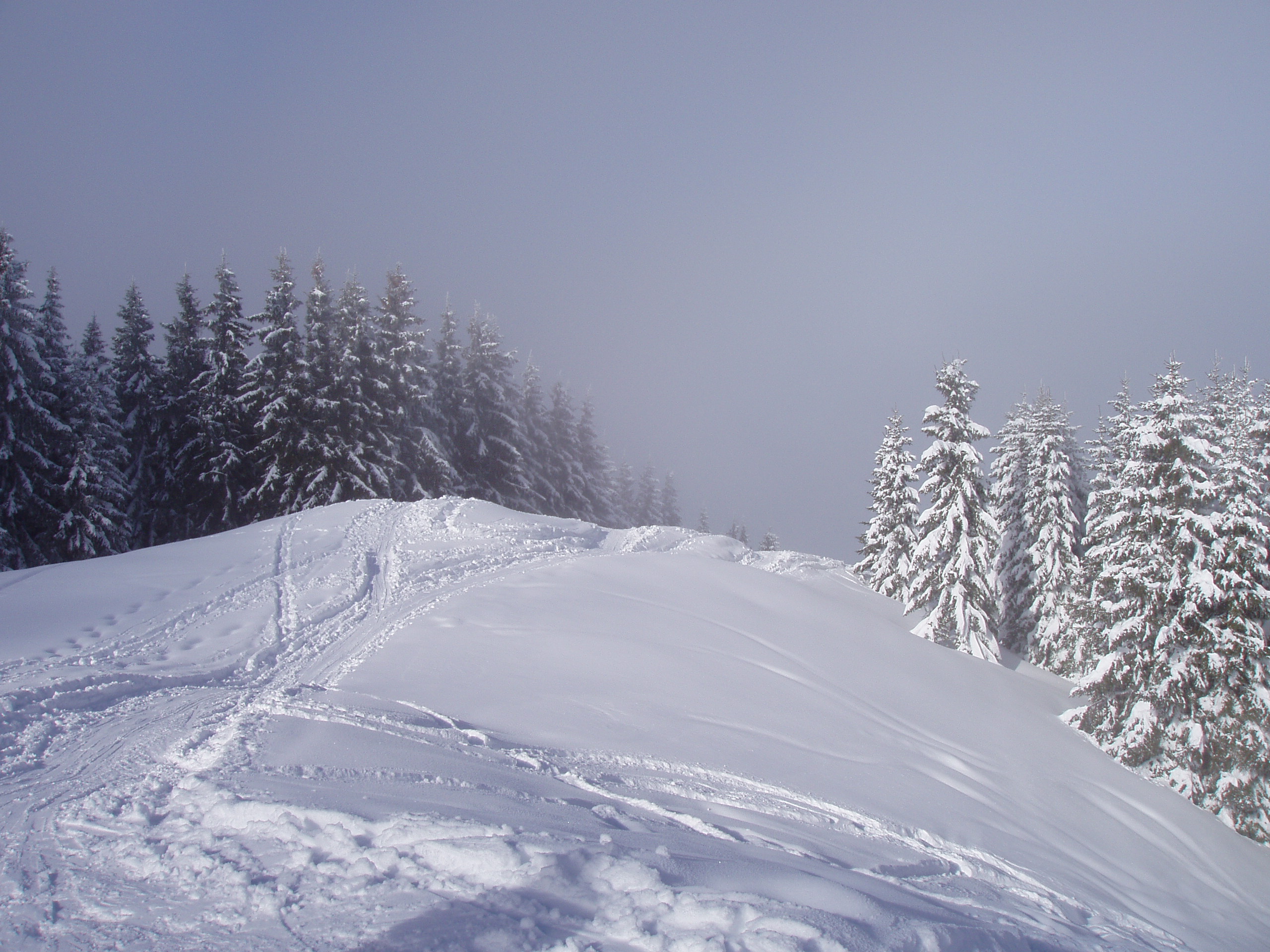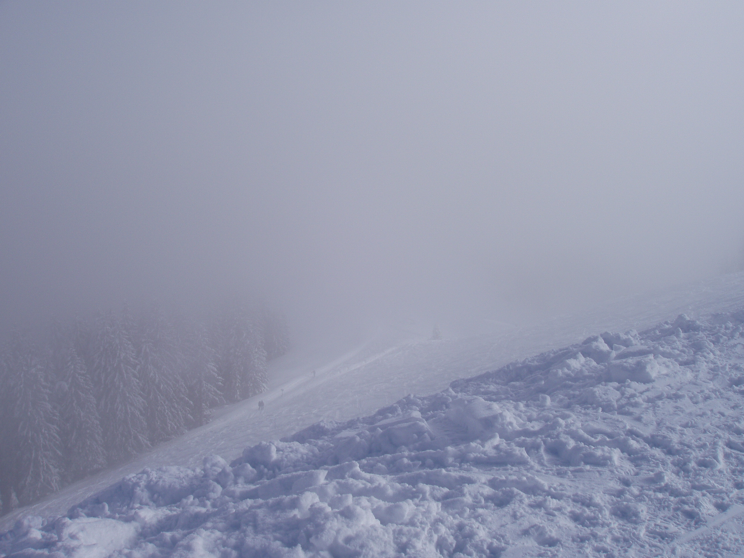 Am Gipfel hob sich manchmal der Nebel. Genug um den schönen Pulverschnee im Osthang zu entdecken. Der kleine Hang machte dann auch richtig Spaß und langsam wurde es etwas heller und sonniger. Die restliche Abfahrt war zwar nicht so toll, aber ich bin immerhin ohne Kratzer durchgekommen. Und am Schluss schien richtig schön die Sonne.