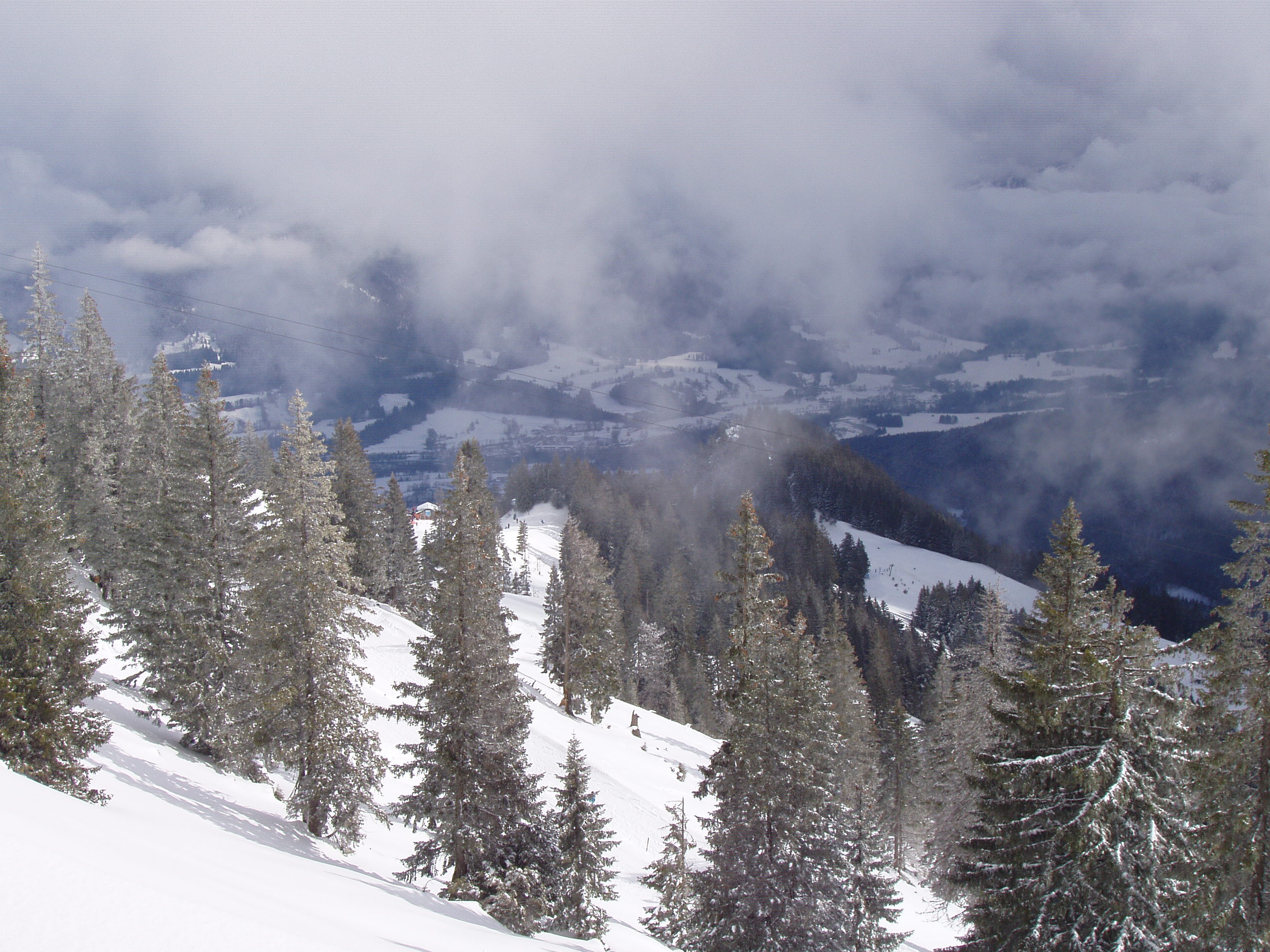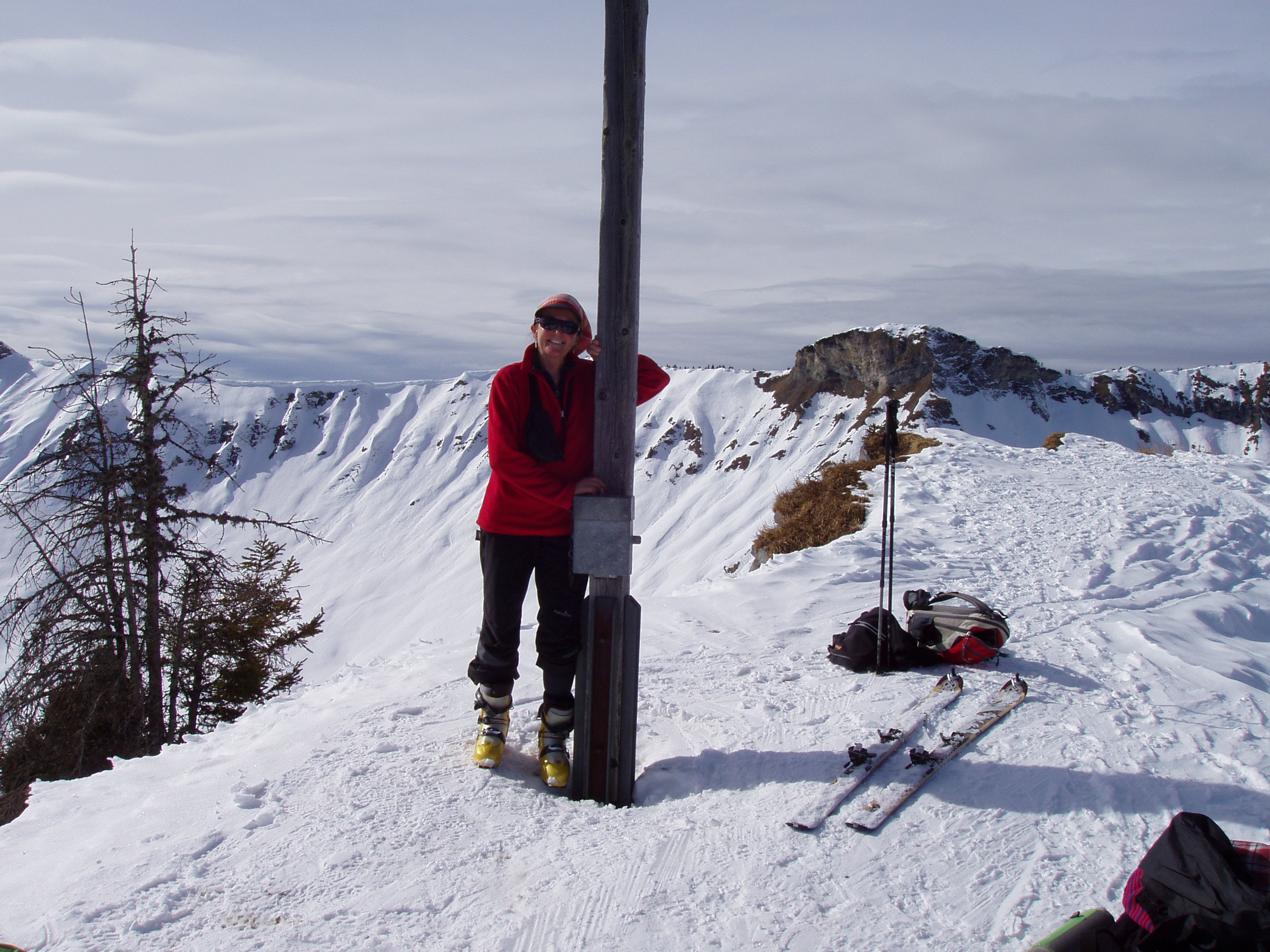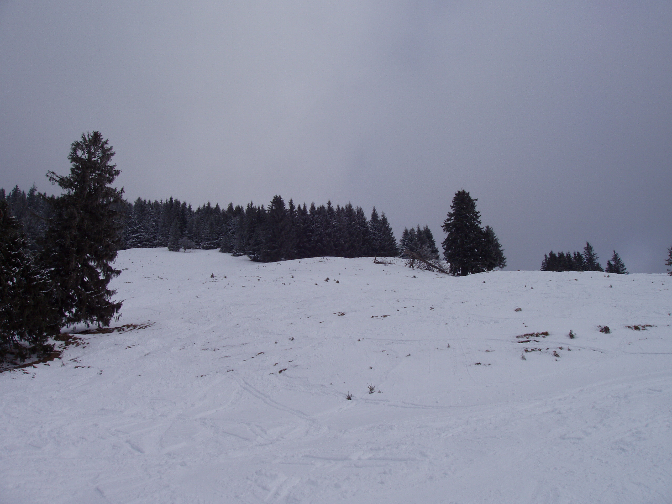 Am Gipfel hob sich manchmal der Nebel. Genug um den schönen Pulverschnee im Osthang zu entdecken. Der kleine Hang machte dann auch richtig Spaß und langsam wurde es etwas heller und sonniger. Die restliche Abfahrt war zwar nicht so toll, aber ich bin immerhin ohne Kratzer durchgekommen. Und am Schluss schien richtig schön die Sonne.