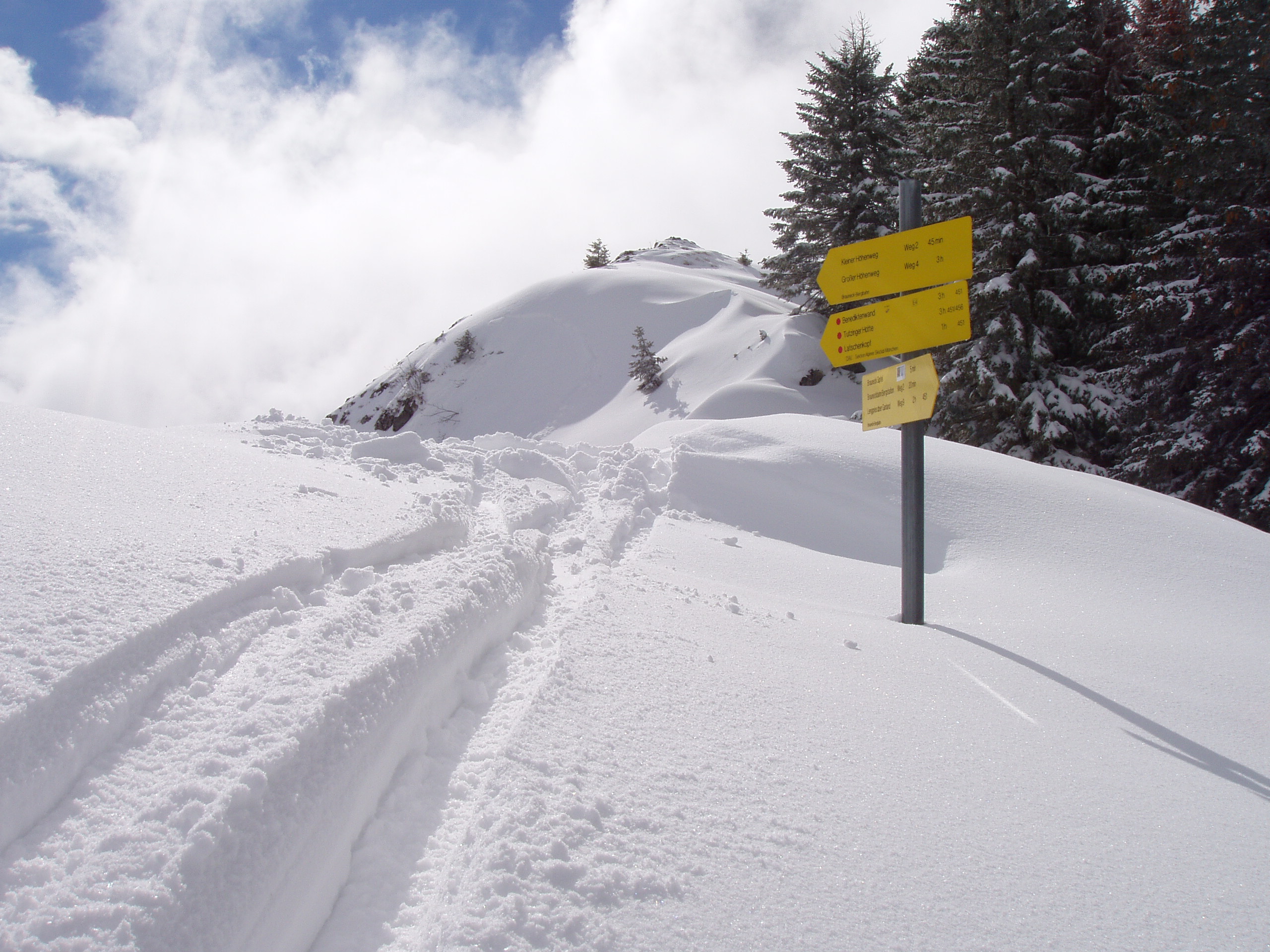 Frau Holle hat wirklich ganze Arbeit geleistet (ca. 20 cm Neuschnee). Start gegen 11 Uhr erwies sich als gutes Timing, weil die letzten Schneeschauer gerade abklangen. Die Sicht reichte zum Aufstieg, mehr aber nicht. Erst am Nachmittag kam Sonne und blauer Himmel durch. Die Spuren-Autobahn führte mich problemlos bis zur Waldgrenze. Noch vor der Bergstation zog ich westwärts und hinauf zum Schrödelstein.