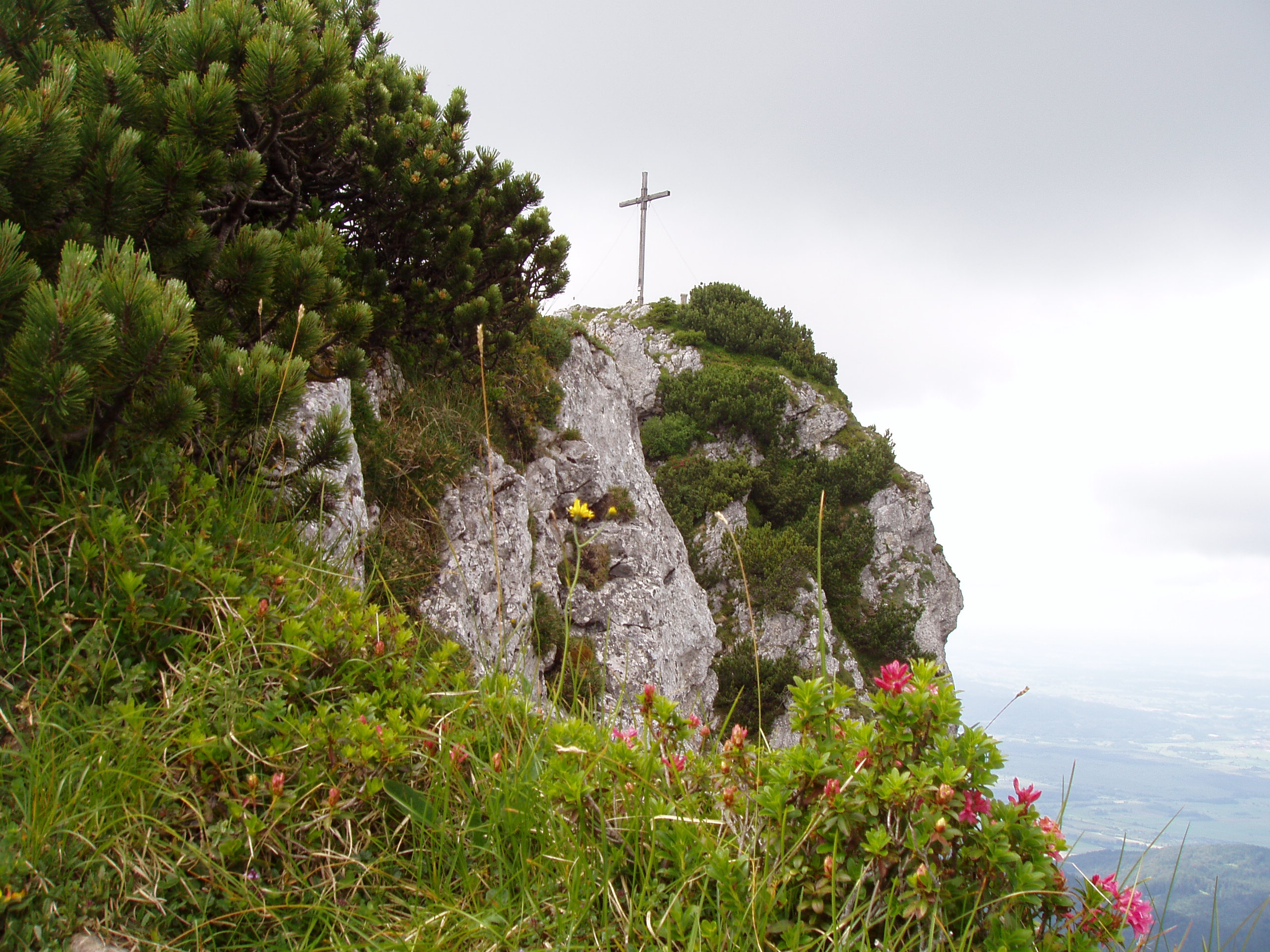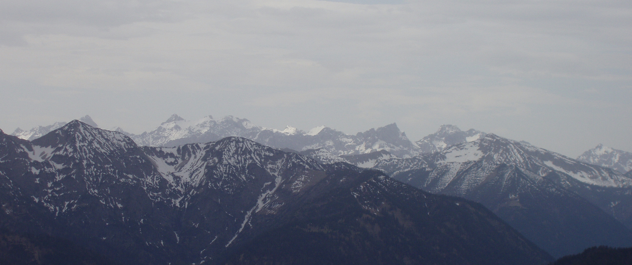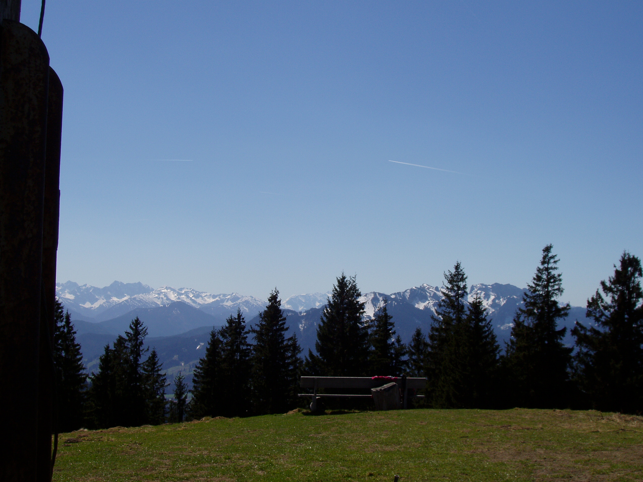 Tourenverhältnisse: Anstatt warm und schwül war es beim Start am Parkplatz (etwa 10 Uhr) eher kühl und bewölkt. Karwendel und Wetterstein lagen im Dunst (sah aus wie Regen?). Erst am Gipfel kam die Sonne heraus (aber dann gescheit). Das Voralpenland lag unter der gelbgrauen Dunstglocke aus Saharasand und Blütenstaub.