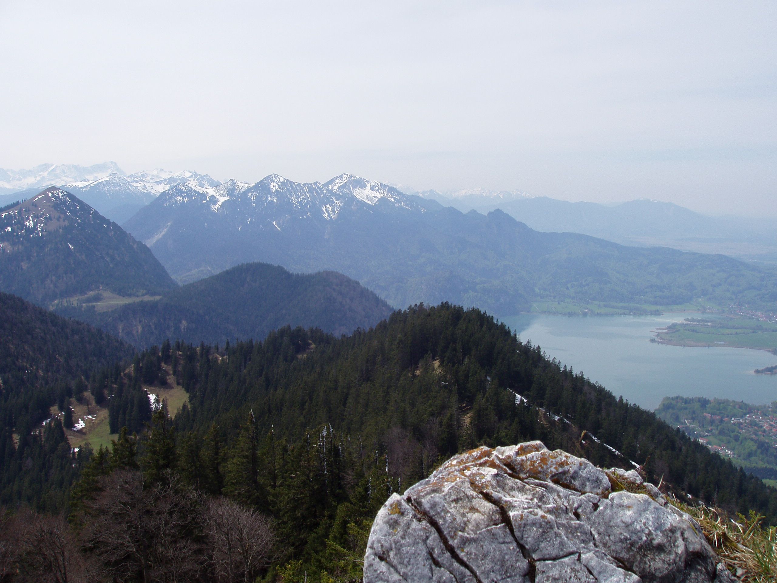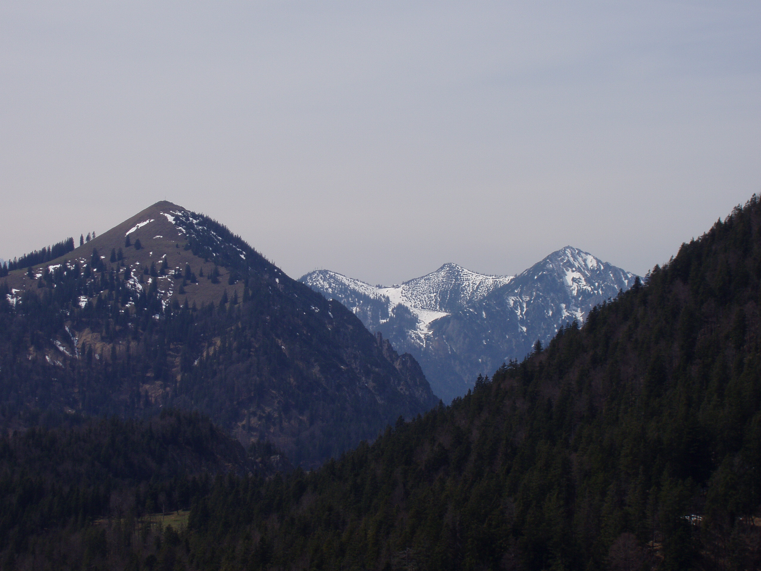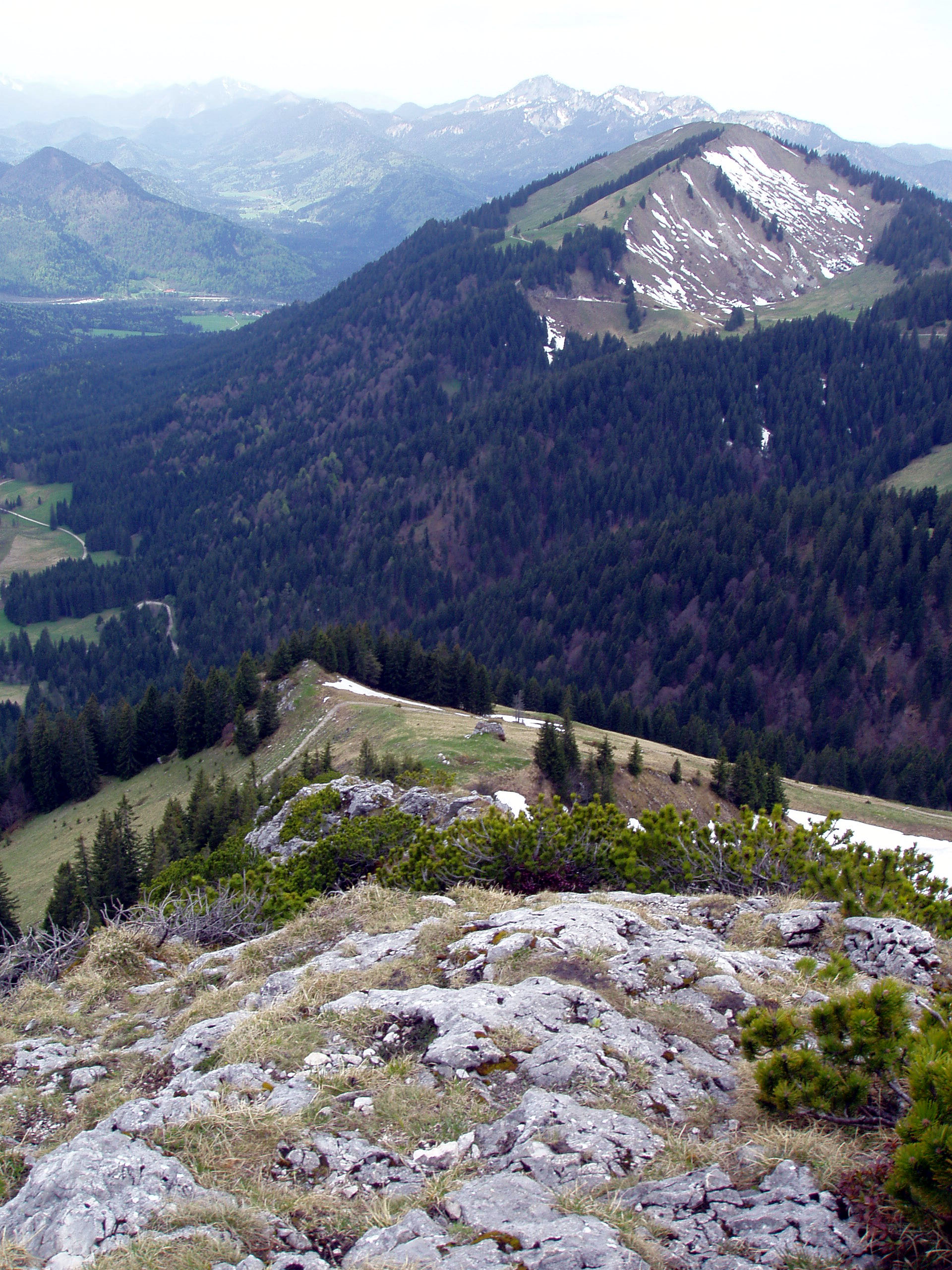 Tourenverhältnisse: Anstatt warm und schwül war es beim Start am Parkplatz (etwa 10 Uhr) eher kühl und bewölkt. Karwendel und Wetterstein lagen im Dunst (sah aus wie Regen?). Erst am Gipfel kam die Sonne heraus (aber dann gescheit). Das Voralpenland lag unter der gelbgrauen Dunstglocke aus Saharasand und Blütenstaub.
