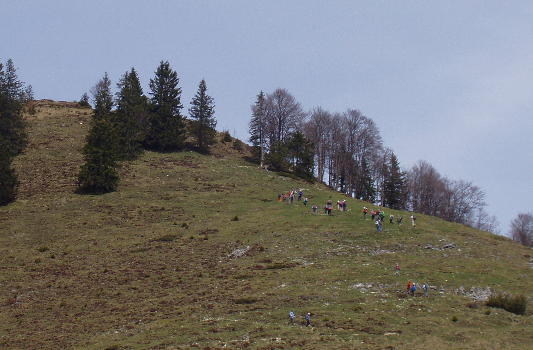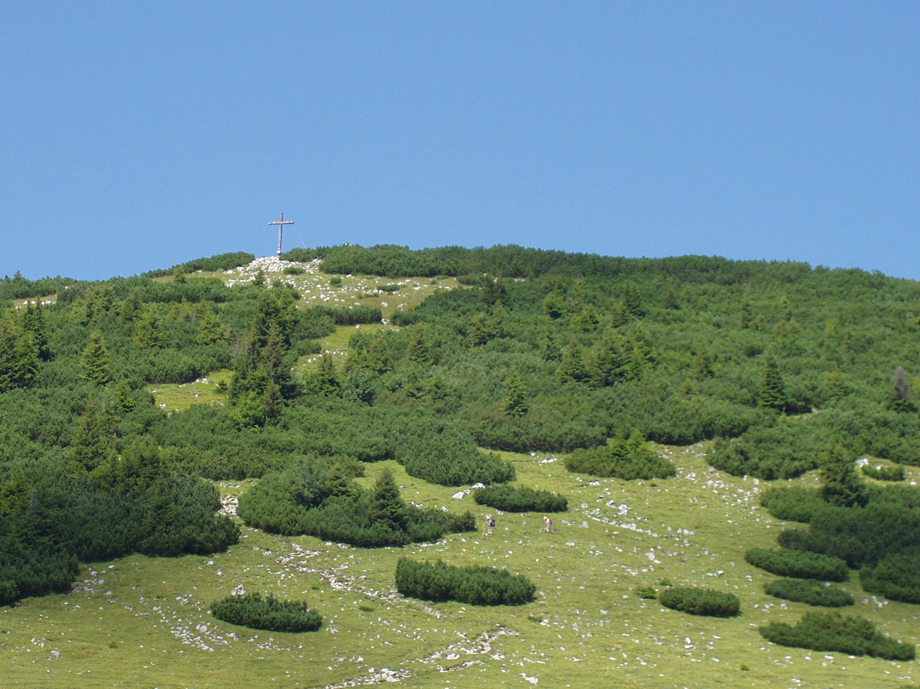 Von dort zu Fuß auf etwas verwilderten Karrenweg bis zu zu einem Wiesenkamm, dann auf einem Pfad zum einsamen Gipfel.