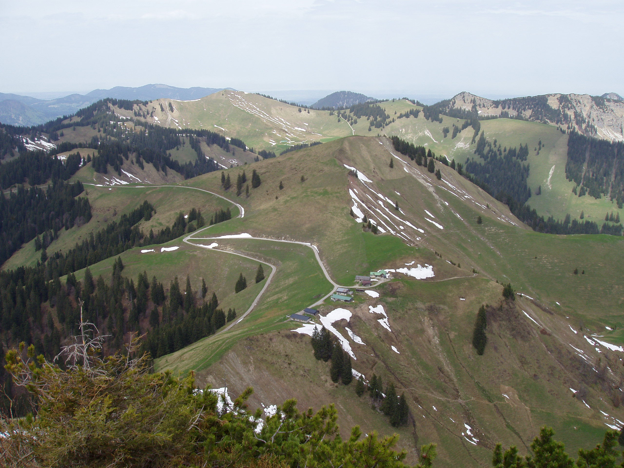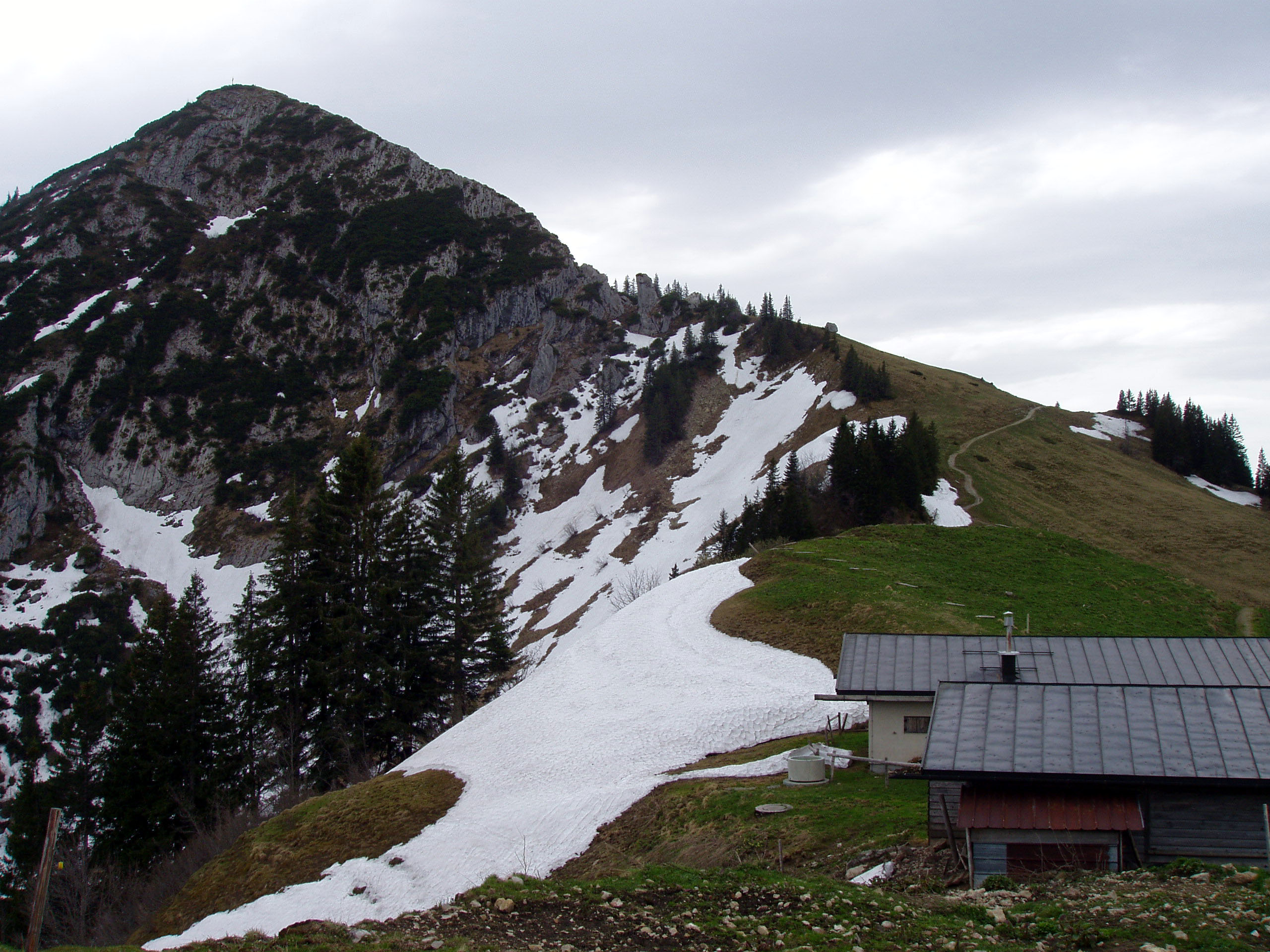 Der Fahrweg/Forststraße über die Röhrlmoos Alm bis zu den Roßstein Almen war schneefrei und griffig wie selten. Das MTB blieb an den Roßstein Almen (1480 m) zurück. Zu Fuß gings über den Gratweg (Lenggrieser Weg) zum Gipfel. Auch hier kein Schnee mehr, genauso der Abstieg über den Drahtseilweg (nur kurz unter dem Gipfel - auf der Nordseite - versperrte ein kleines Schneefeld den Weg - konnte aber gut umgangen werden)