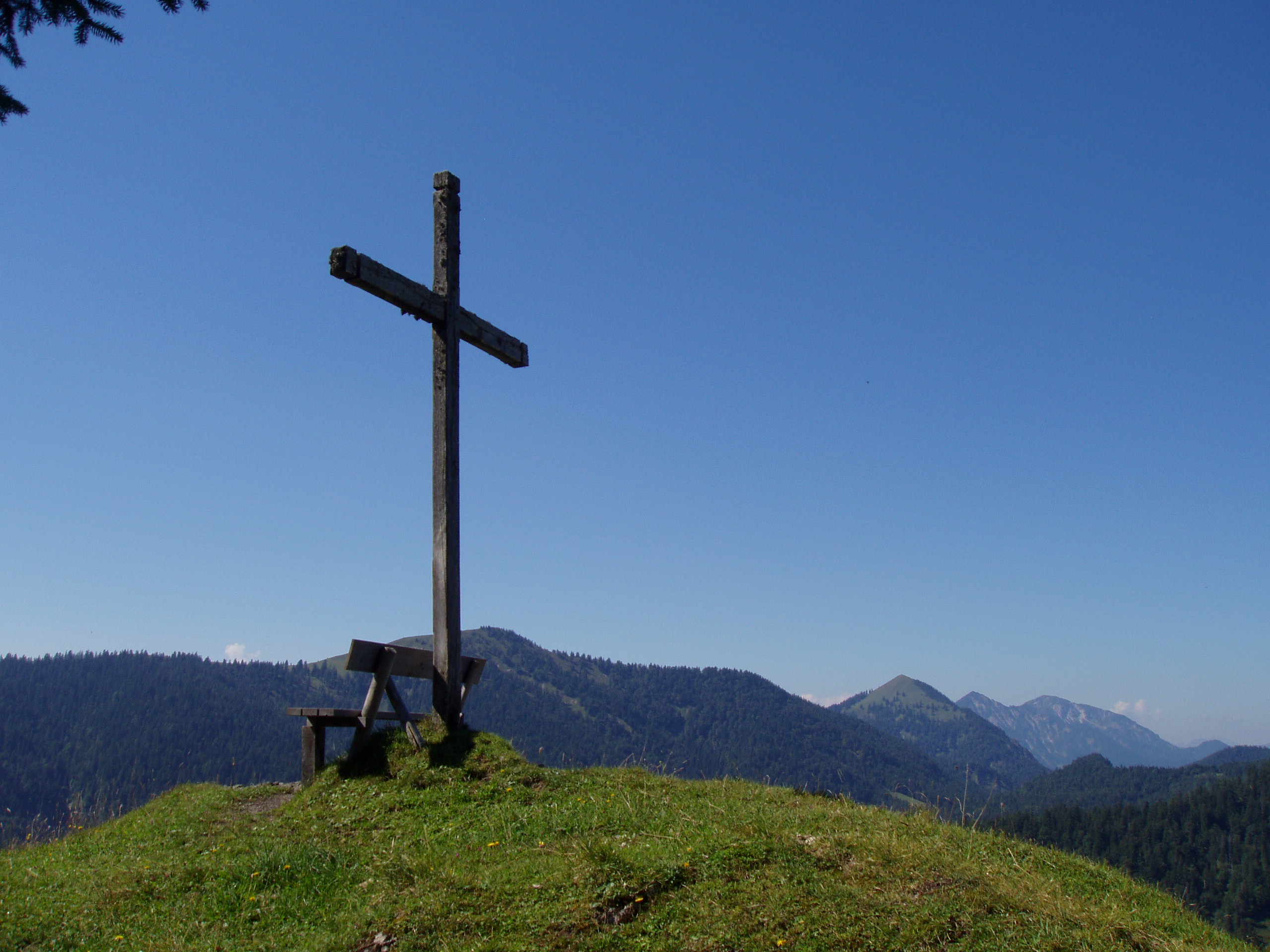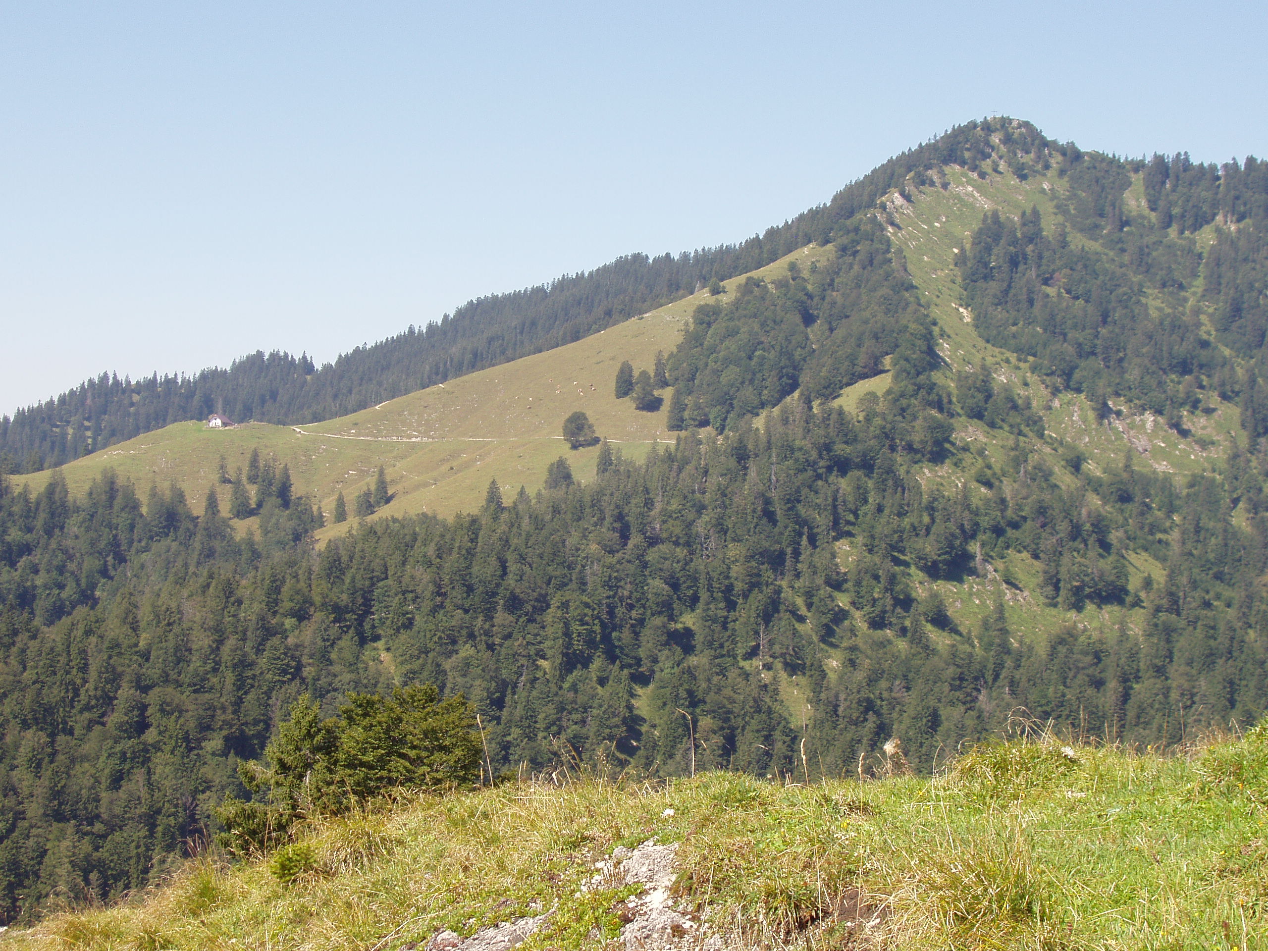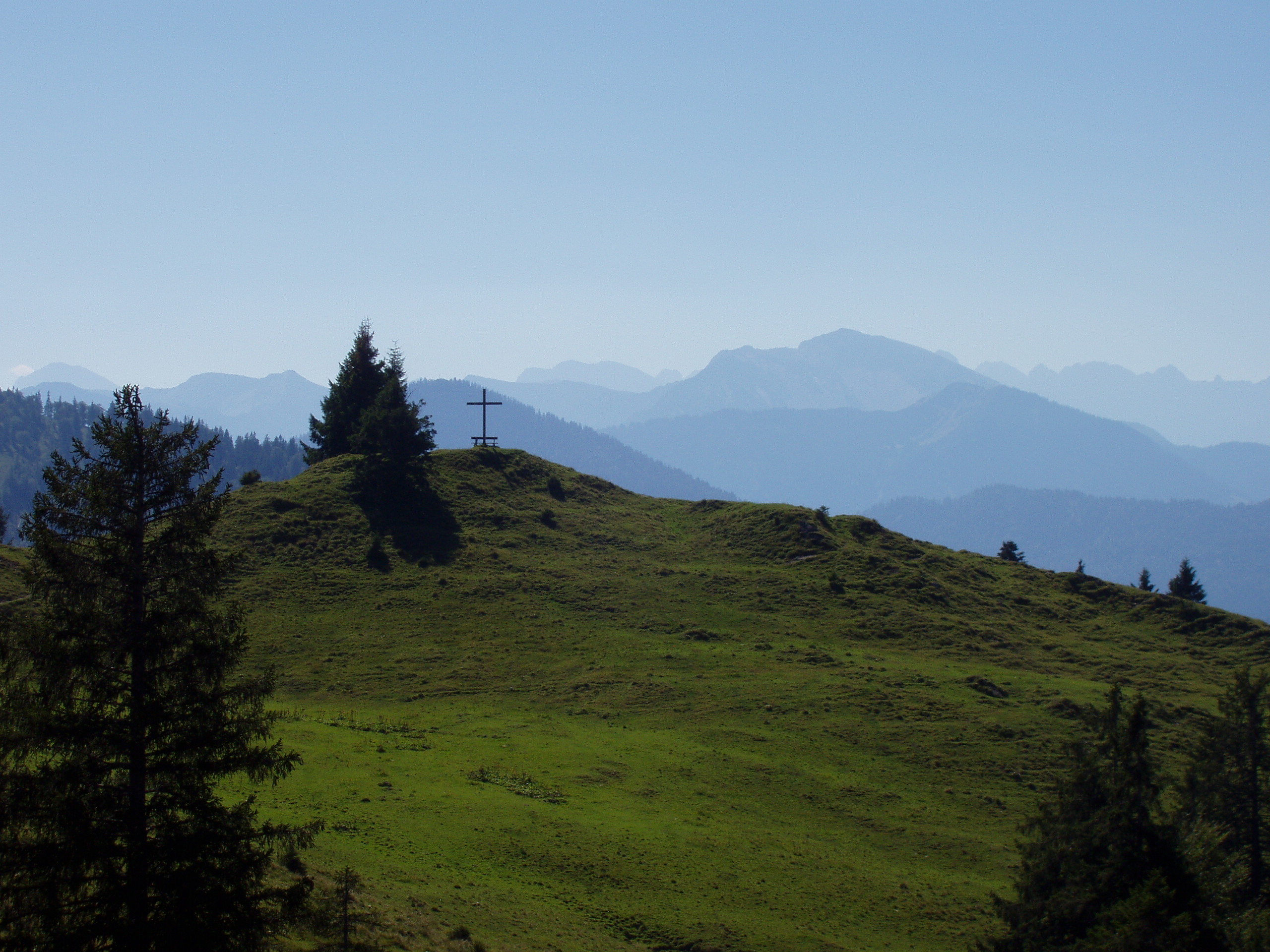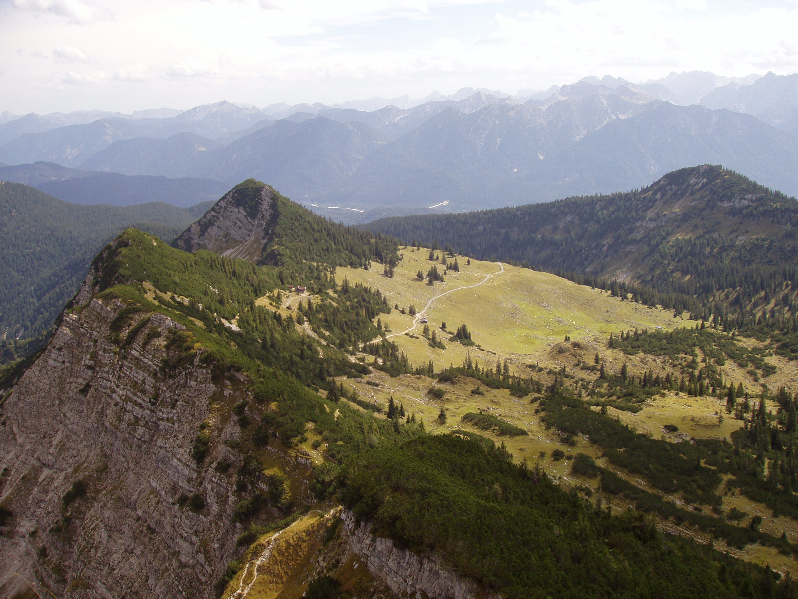 mit dem MTB über die schattige Forststraße bis zur Orterer Alm (1085 m) aufgefahren. Die Hütte ist im Sommer am Wochenende und an Feiertagen bewirtschaftet. Dann zu Fuß unter kühlenden Bäumen bergauf bis zum Wiesensattel mit Kreuz. Da der Rabenkopf wegen Überfüllung geschlossen war (Scherz) folgte ich heute dem Pfad nach links, Richtung Benediktenwand. Der kaum begangene Höhenweg führt sehr aussichtsreich und beinahe flach zur Achala Alm (Abzweig nicht übersehen). Oberhalb der Hütte ist auf einem Grashügel ein Kreuz und eine Aussichtsbank :) .....
