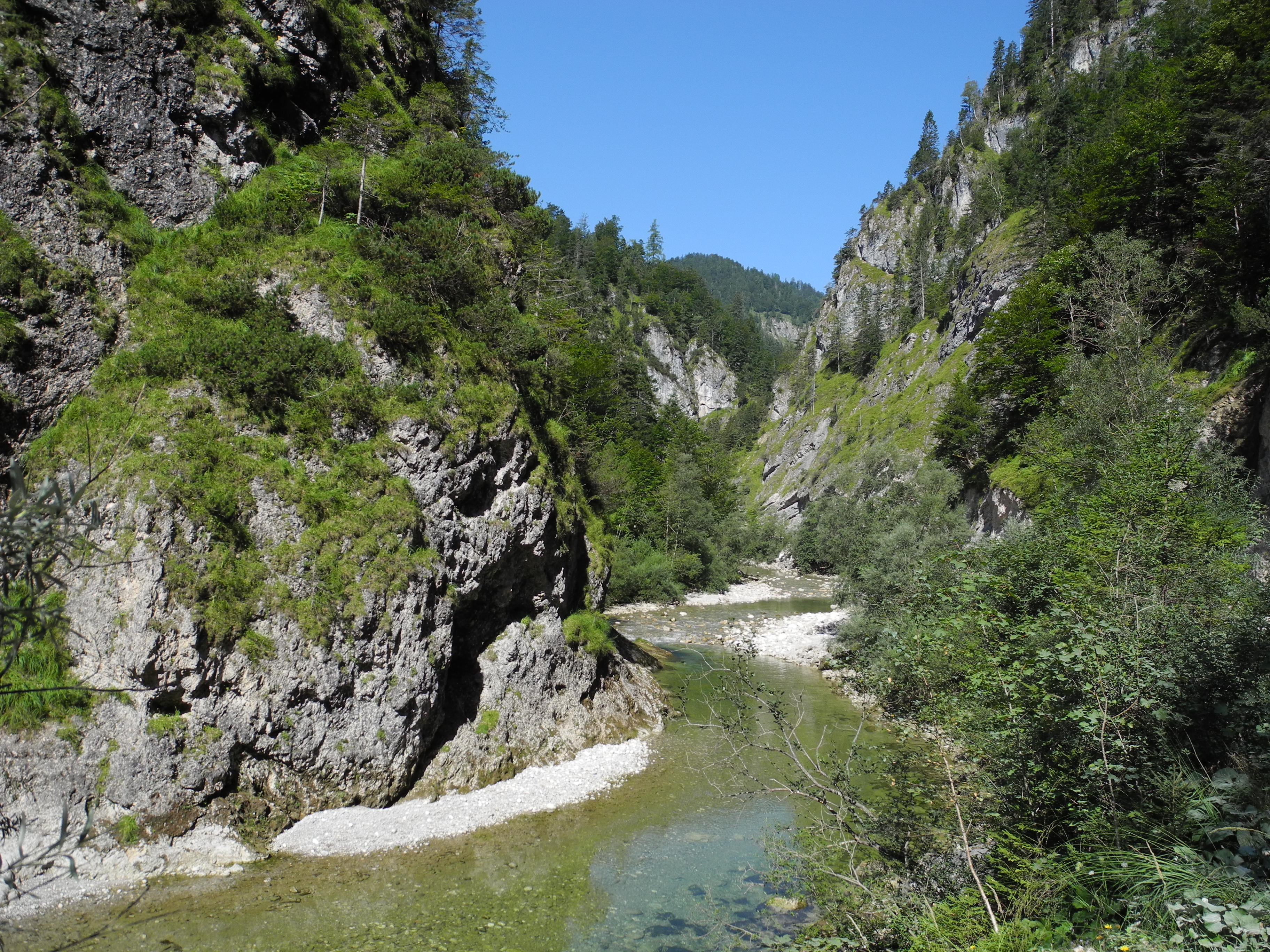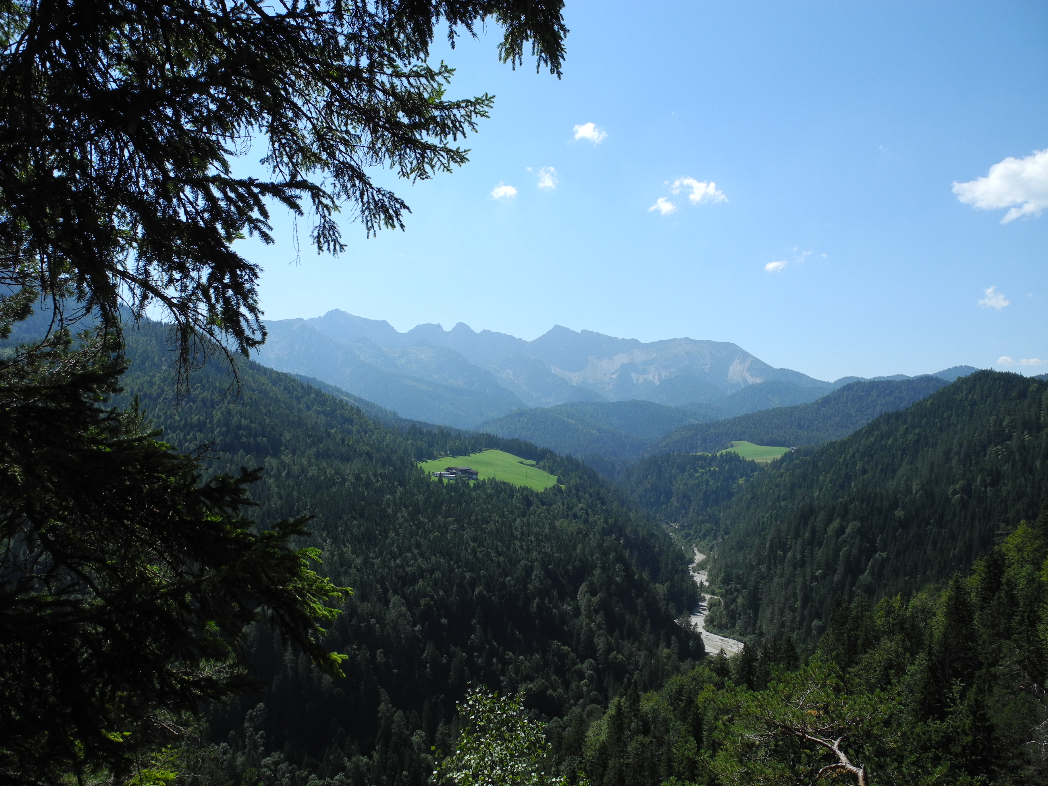 Der höchste Punkt, die Rotwandalm (bewirtschaftet), ein wirklich göttlicher Platz mit Karwendelpanorama. Die Abfahrt über die malerischen Zotenalmen brachte Gardasee-Schotter bis Planierraupenplatten Untergrund. Dann im lauschigen Bächental lockeres Rollen bis zum Abzweig Walchenklamm vor der Dürrachbrücke. Mit viel Sylvensteinseeblick und vorbei an Wasserfällen nochmal recht ordenlich Bergauf Bergab.
