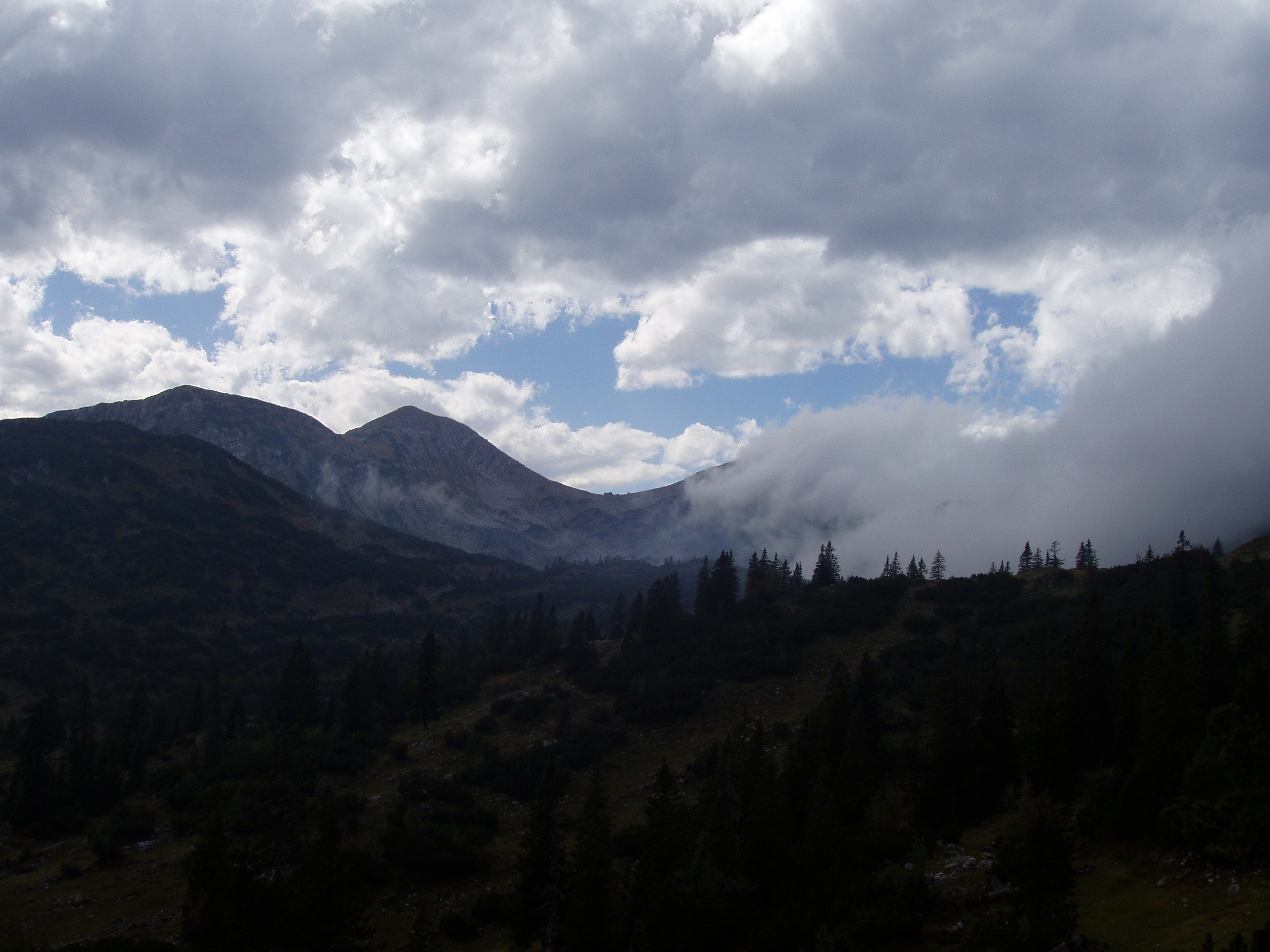 Schon gegen 13.30 Uhr kamen blitzschnell dichte Nebelschwaden aus den Tälern von Westen herauf. Bald waren alle Gipfel völlig im Nebel und später bei der Abfahrt fing es an zu tröpfeln (so schwitzte ich beim Gegenanstieg wenigstens nicht mehr).