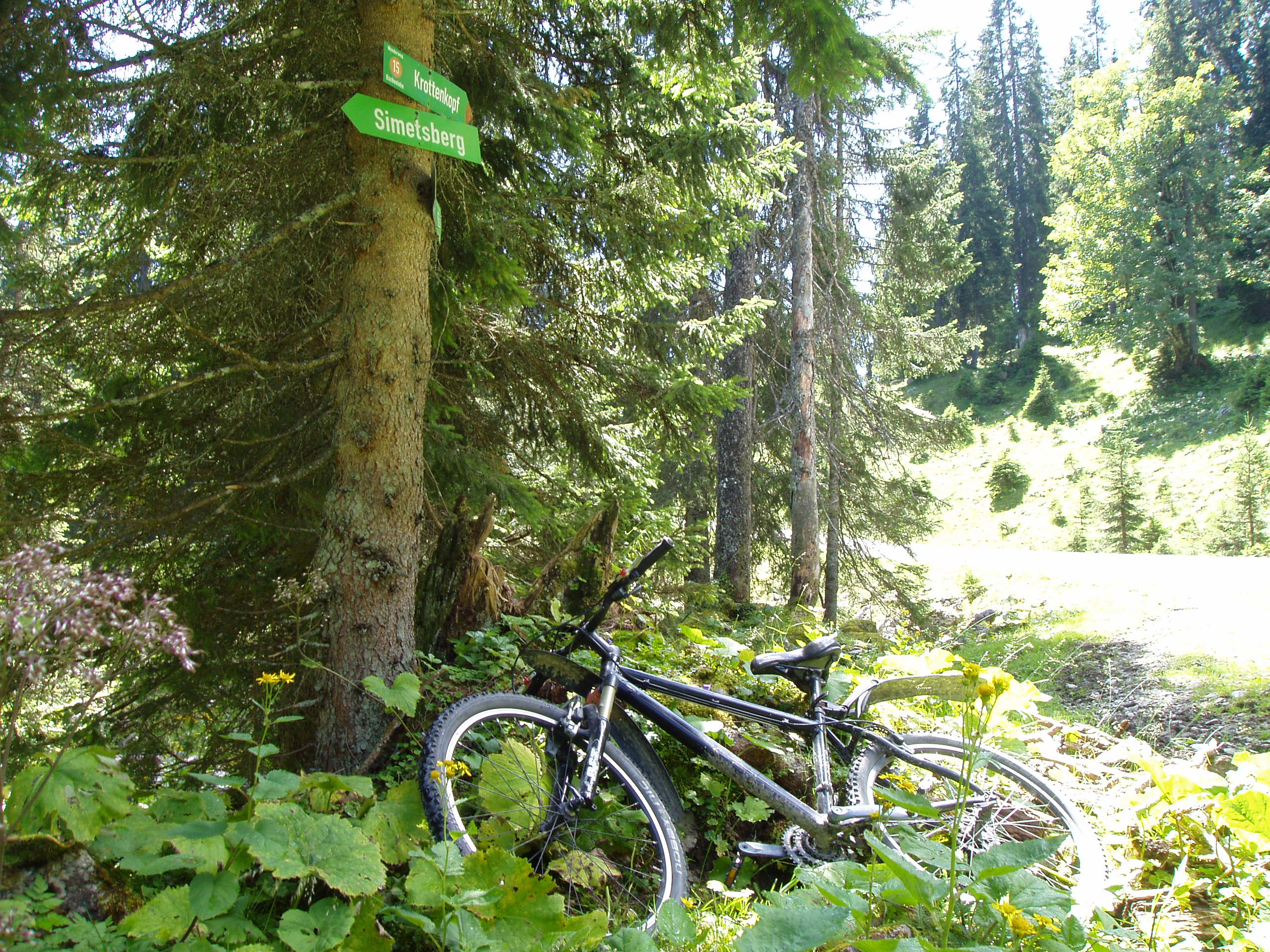 Tourenverhältnisse: Beim Start um ca. 11 Uhr lag ein Teil der Tour schon im Schatten. Die Forststraße war super griffig und es war wenig los - die meisten waren wohl schon unterwegs. Ich bin die Piste hinaufgeradelt bis zum unauffälligen aber beschilderten Linksabzweig "Simetsberg", ca 1450 m. Hier blieb das MTB zurück.