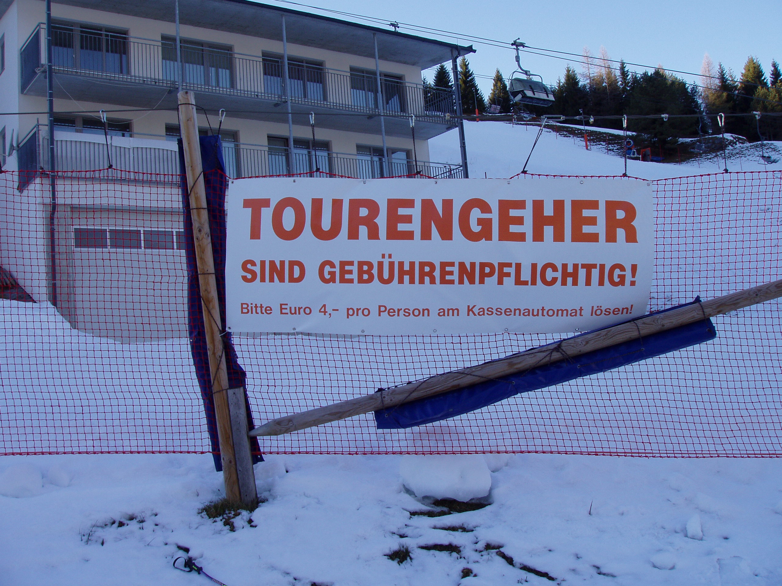 Sonstiges: Neu für mich ist das Schild am Anfang der Piste: "Tourengeher sind gebührenpflichtig, bitte 4 Euro pro Person am Kassenautomat lösen".