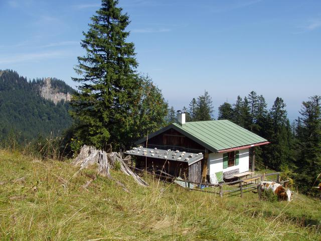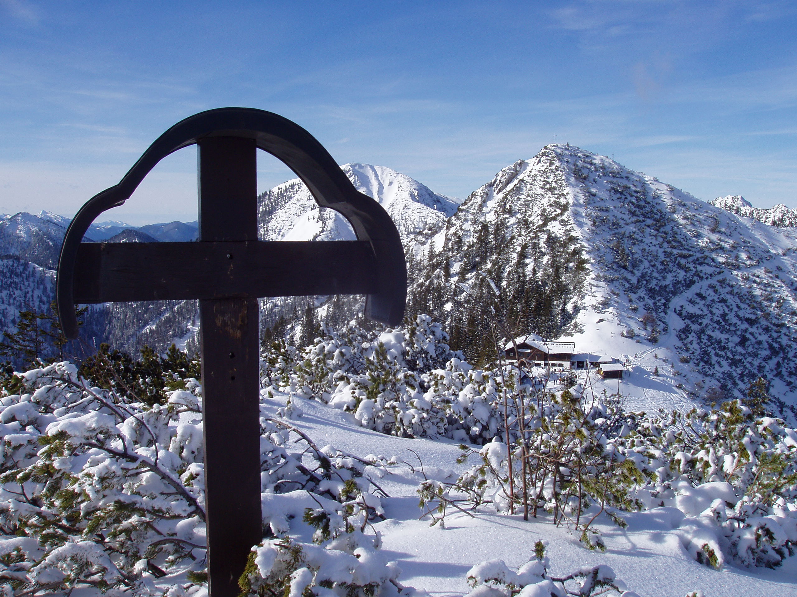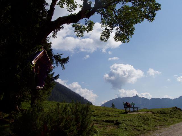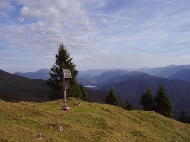 Kurze Stichtour über die Forststraße zur Wallgauer Alm (1548 m), von dort kleiner Fußmarsch Richtung Krüner Alm über hügelige Bergwiesen auf einen Aussichtspunkt mit Marterl (ca. 1580 m). Schöner Blick auf den Walchensee, Karwendel, Wetterstein....