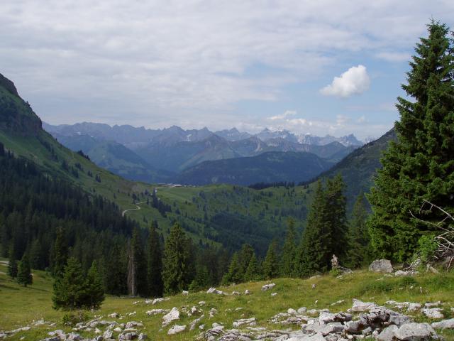 Dann zu Fuß über einen schönen steileren Wurzelweg durch lichten Bergwald. Auf freier Wiese zum Stierkopf und weiter zum Hinteren Hörnle.