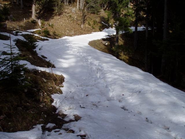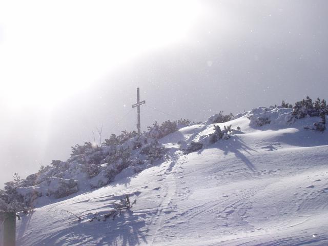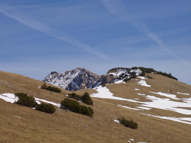 Tourenverhältnisse: Man kann noch vom Parkplatz mit Ski weggehen über die kleine Piste. Auf der Forststraße jetzt ca. 1 Min. Ski tragen. Ansonsten noch ganz passable Schneeverhältnisse. Heute um ca. 8.15 war die Schneedecke noch hart. Die Sonne schien zwar, war aber leicht verhangen. Im Laufe des Tages (es war ziemlich warm) wurde der Schnee sulzig, war aber nicht bis zum Boden durchgeweicht. Am Gipfel wenig Schnee. Die Abfahrt war pistenartig eingefahren. Ich fuhr am Schluss über die Forststraße ab, die war glatt und schön aufgefirnt.