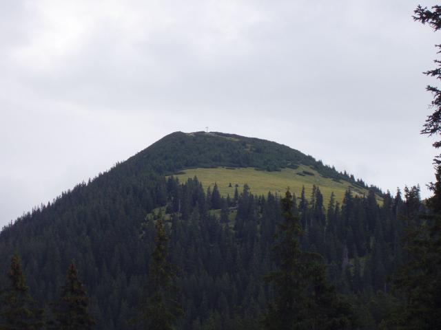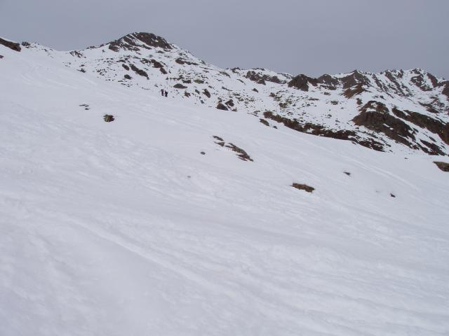 Zu Fuß über einen breiten steinigen Grashang weglos zum höchsten Punkt aufgestiegen. Eine Latschengasse führt zum freien aussichtsreichen Gipfel, den eine schlichte Solarzelle (o.ä.) ziert.