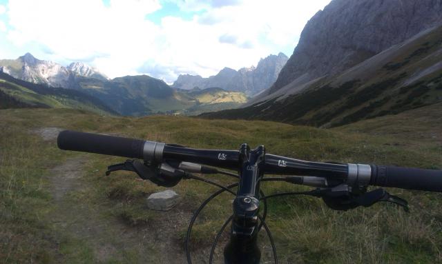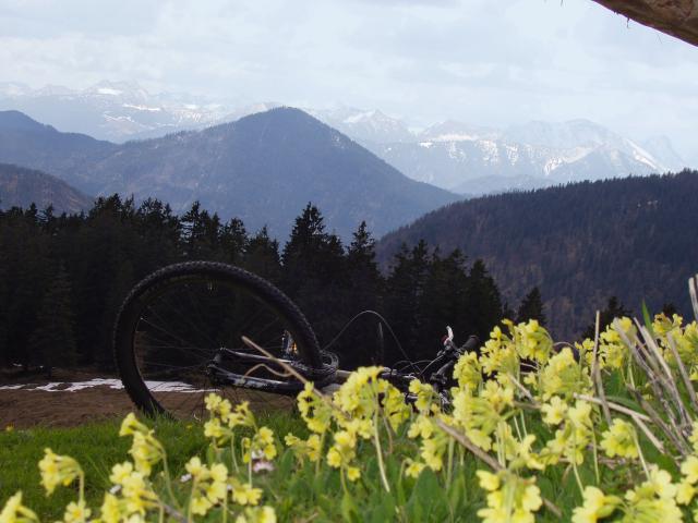 Tour: Dank der angenehmen Temperaturen war die sonnseitige MTB-Auffahrt super. Es ging auf der Forststraße bis zum Kreuz (ca. 1450 m) oberhalb der Vereiner Alm (dort MTB-Depot - nachdem mir auf der Wettersteinalm kürzlich jemand den Reifen durchgestochen hat, verstecke ich mein Radl jetzt lieber).