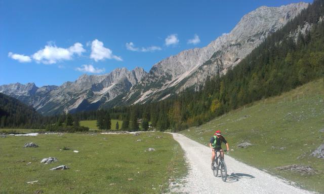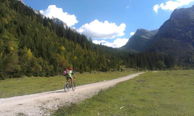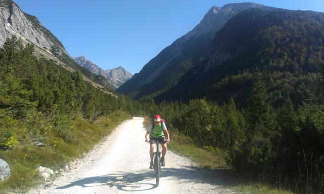 Tour: Auf der bequemen Forststraße mit dem MTB bis zur Wetterstein Alm (1464 m), bewirtschaftet - dort MTB-Depot.