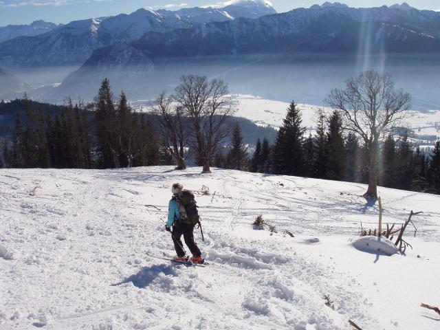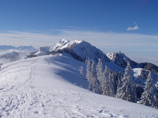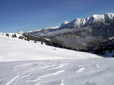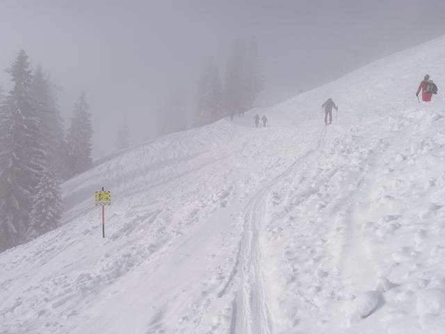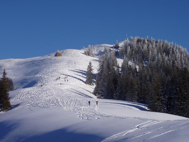 Von Anfang an mindestens ca. 15 cm Pulverschnee (weiter oben viel mehr). Aufstieg unter der Lifttrasse bis Schönfeldhütte, kurze Abfahrt bis Untere Schönfeldalm. Aufstieg zum Jägerkamp (1746 m).