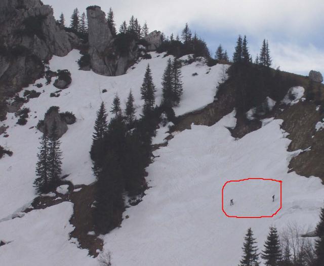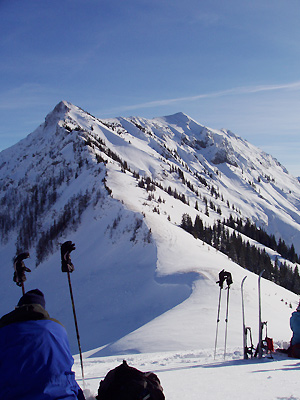 Tourenverhältnisse: Am späten Vormittag gab es westseitig noch Pulver, südost feucht und schwerer werdend (es war sonnig und warm, einzelne Wolkenfelder)