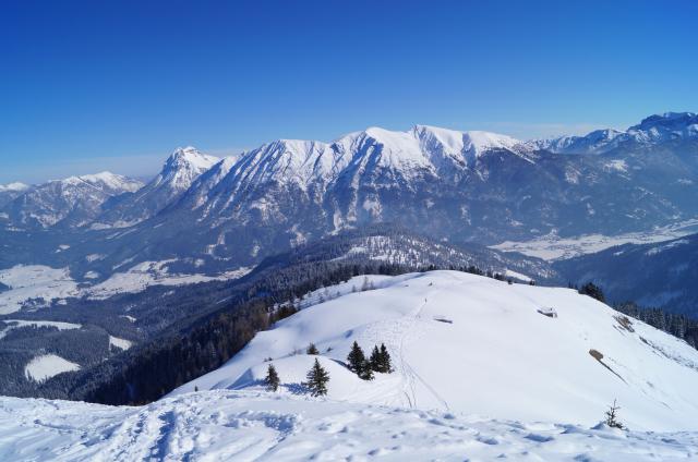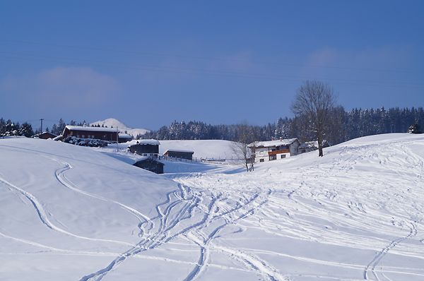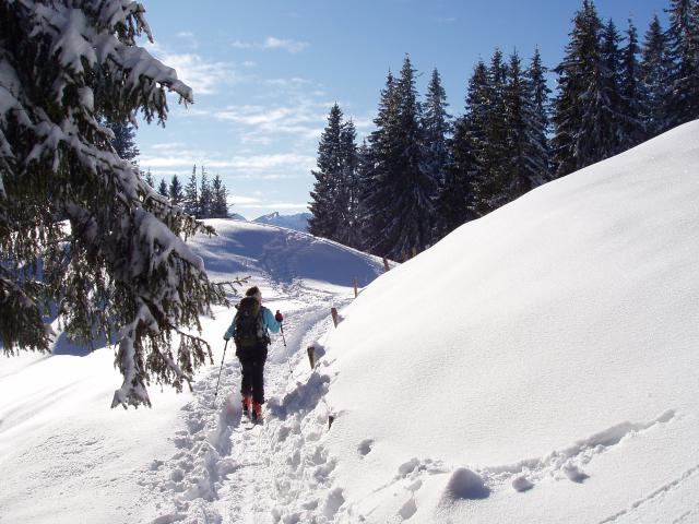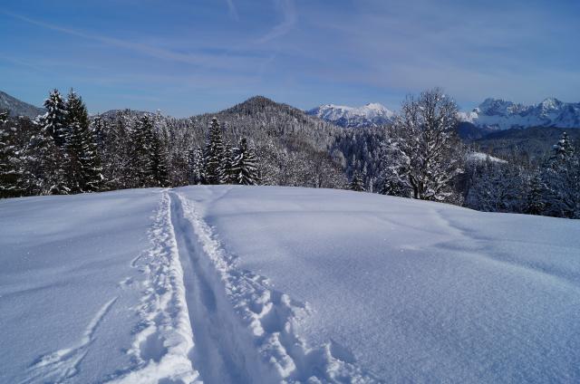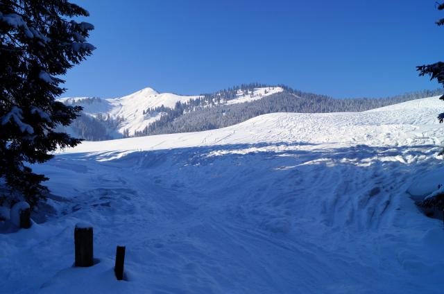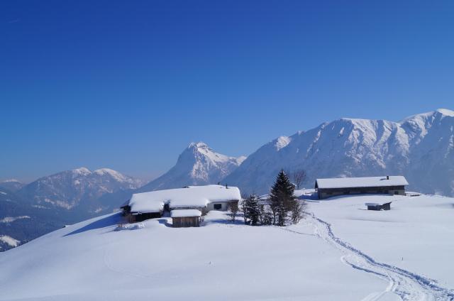 Tourenverhältnisse: Forststraße und Falkenmoossteig zur Falkenmoosalm gut eingeschneit. Einzelne Lücken können problemlos umgangen werden.