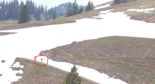 Tourenverhältnisse: MTB-Strecke bis Roßsteinalmen (1480 m) endlich schneefrei. Durch den letzten ca. 3 m langen Schneestreifen führt eine breite (fahrbare) Spur.