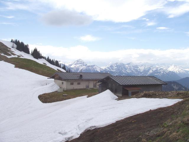 Roßsteinalmen hoch. Hinter den Almen und auf der Nordseite von Roß- und Buchstein lag noch massig Schnee.
