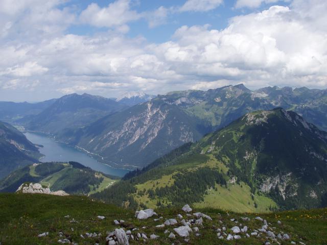 Zu Fuß über grasigen Rücken zum Stanserjoch (2102 m). Blick (fantastisch) jetzt auch ins Rofan und auf Achensee.