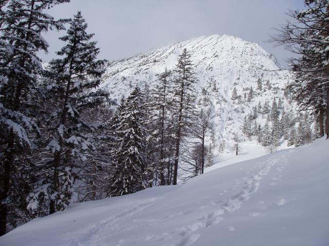 Abfahrt: Ich habe mich ab den Gröben Almen, ca. 1500 rechts gehalten (war nicht schlecht) und bin etwa auf Höhe des Ombrometers (ca. 1300 m) über ein eingeschneites Bachbett zurück zur Aufstiegsroute. Dann über die Waldschneise hinab zur Hochstegen Alm (1160m). Die Waldschneise war der Horror (Bruchharsch, alte gefrorene Skispuren leicht eingeschneit). Nach der problemlosen Bachüberschreitung auf der Forststraße ins Tal zurück.