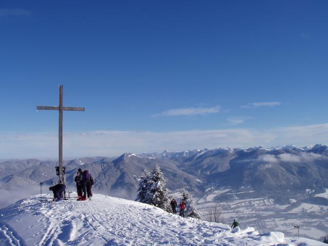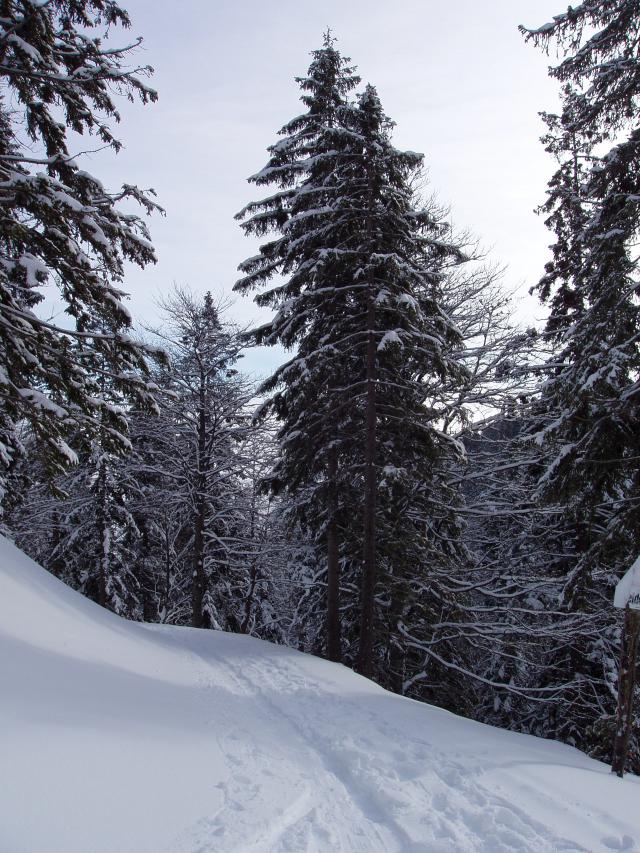 Tourenverhältnisse: Gute Verhältnisse. Alles dick eingeschneit. Der Schnee war größtenteils noch pulvrig, wenn auch zerfahren. Stellenweise traf man bei der Abfahrt schon auf eine leichte "Haut", war dennoch noch gut zu fahren. Die kleine Abfahrtsvariante über die Osthänge bis zum Jägerstand war super.