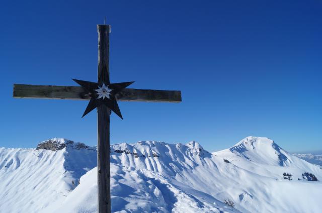 Es lagen ca. 10 cm Neuschnee auf einer meist harten Altschneedecke. Gipfelanstieg zu Fuß, da schneefrei.