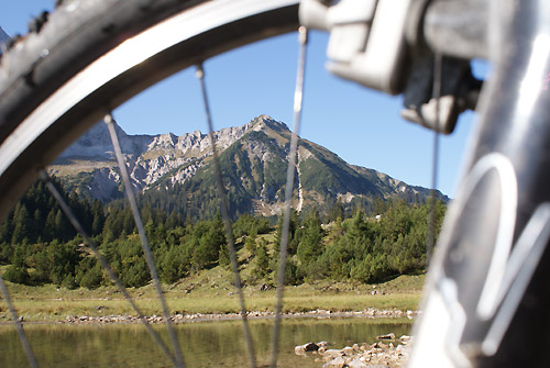 Abstieg: Über den unauffälligen aber markierten Weg durch Latschenhänge zurück zur Ritzelbergalm. Von dort zurück zum MTB.
